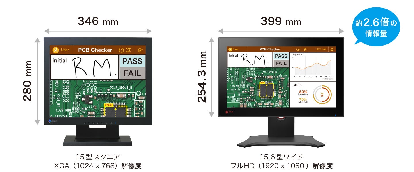 15.6型ワイド画面のフルHDモニターは、15型スクエア画面のXGAモニターと同等の設置面積で、約 2.6倍の情報を表示できます。