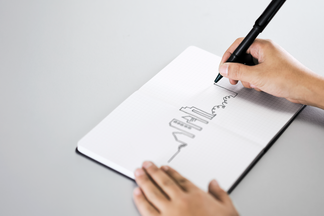 一枚の紙のように広がるキャンバスが、従来の端から順に書く規則的な筆記スタイルを、全体を俯瞰する自由な筆記スタイルへと変革します。