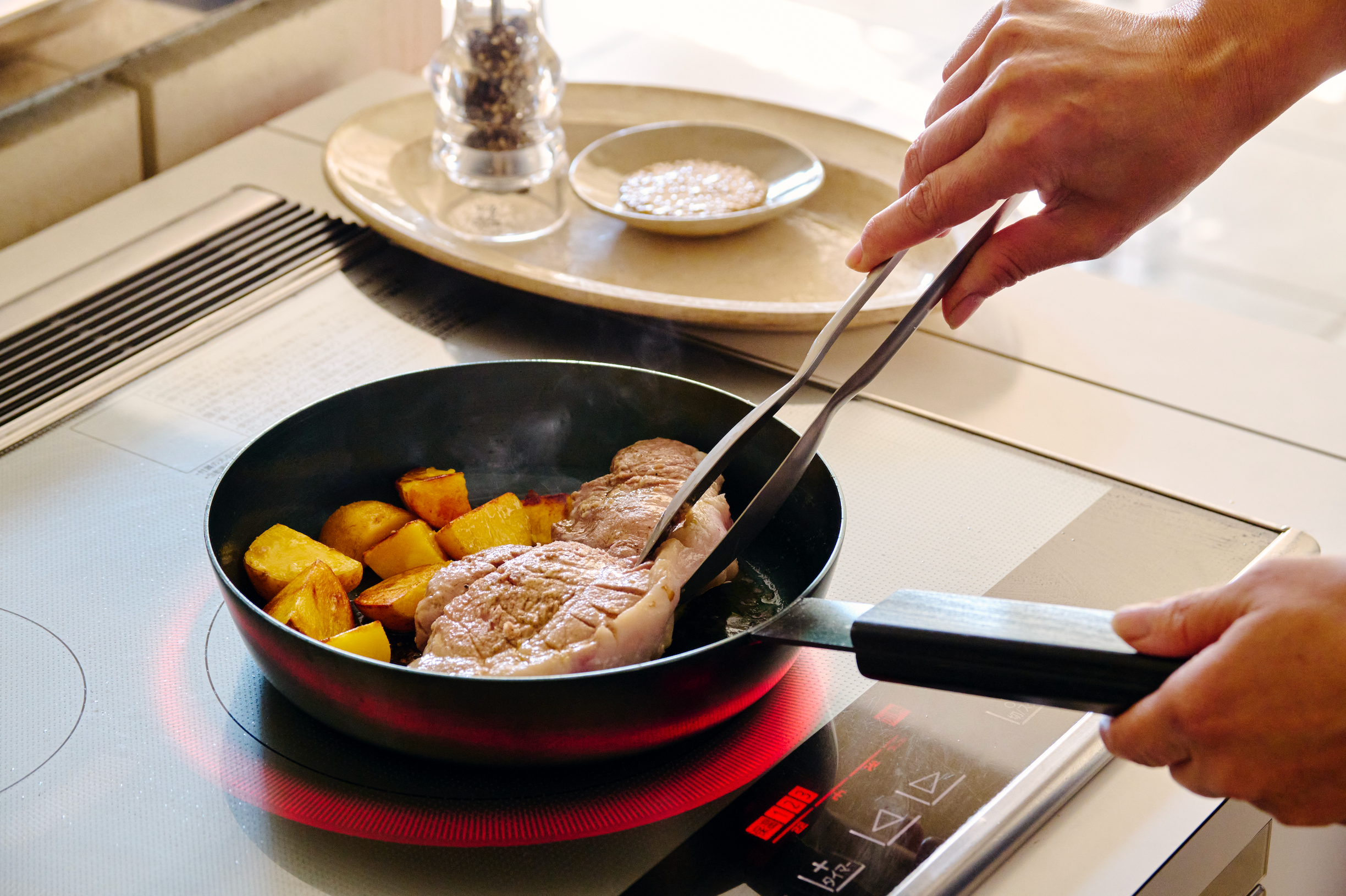 鉄板の厚さが1.8mmと厚く、じっくりと熱が食材に伝わります。また、熱変形に強くIHクッキングヒーターでも安心してお使いいただけます。板厚による蓄熱量の増加に加え、耐久性も兼ね備えています。