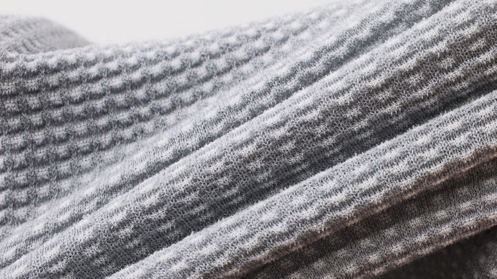 「ワッフル ウール」シリーズのファブリックには、18.5μmの極細メリノウール(エクストラファインメリノ)を使用しています。細い糸を使用することで、素材の縮みが少なく、ウールによくある着用時のチクチク感を大幅に軽減しました。