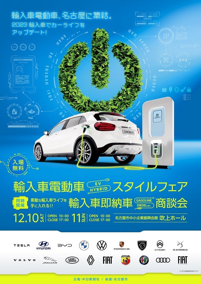 地球温暖化防止に向けて、世界の自動車メーカーが電動化にシフトしています。日本政府は、「2035年までに、乗用車の新車販売で電動車100%を実現する」という目標を掲げており、中でも海外のメーカーは、続々と魅力的な電動車を日本国内に導入しています。そこで、お客様に電動化モデルを身近に感じてもらうことを目的に、「輸入車電動車(EV/HYBRID)スタイルフェア<主催・中日新聞社、後援:名古屋市>」を2022年12月10日(土)11日(日)の2日間、名古屋市中小企業振興会館「吹上ホール」で開催いたします。