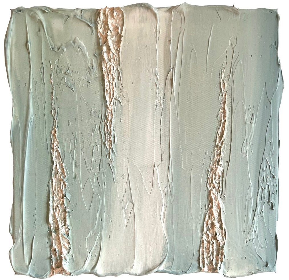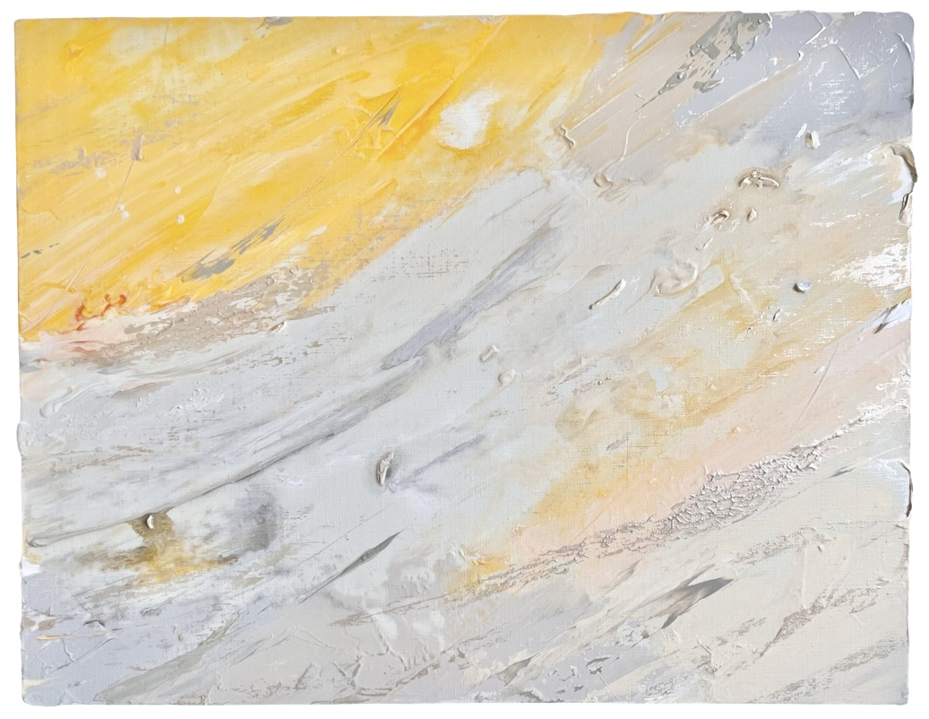 雲が流れ、時が流れ、だんだんと空が晴れ渡り光が差す様子を描いた作品。2023年に生まれた新シリーズで、作者自身がスランプを抜けたときに頭の中に広がったイメージを作品したシリーズ。雲や霧が晴れることから派生して、作品を目にするたびにすっと心が軽くなったり、心の中がすみわたるような存在になればと願いが込められている。