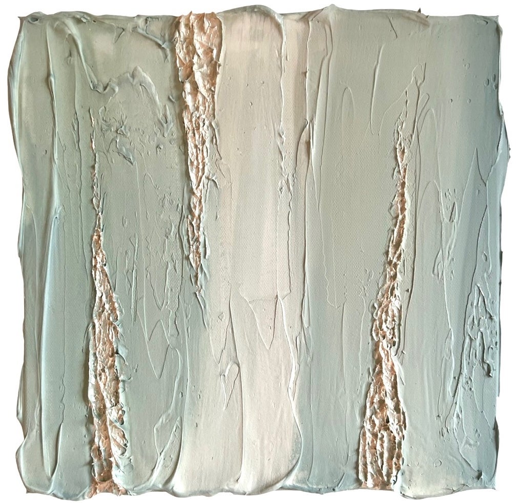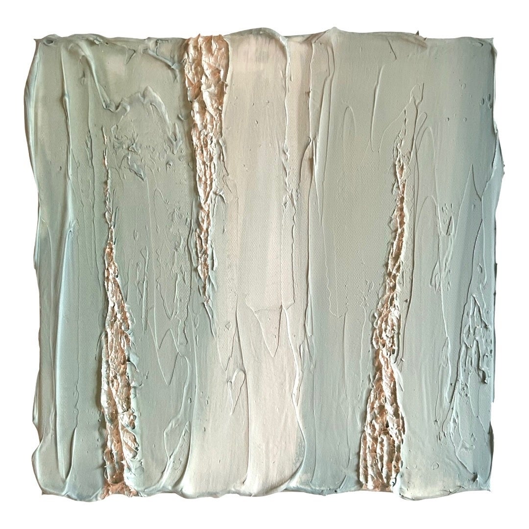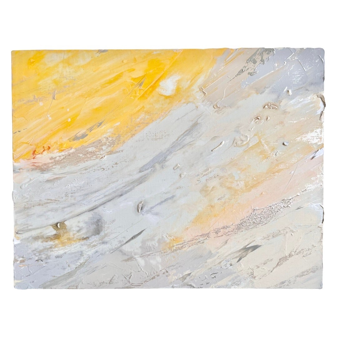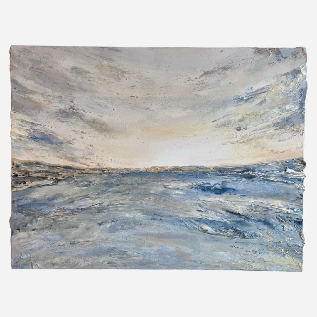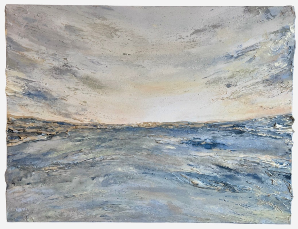 どこまでも広がる、無限の空と地平線。その間にある境界線は、太陽の光でキラキラと輝く瞬間、溶け合って1つになり、その境目がなくなる。そんな瞬間を表現した作品シリーズ。抽象画のため、環境や心境などによって「どう見えるか」が変化します。朝陽や夕陽に見えたり、海