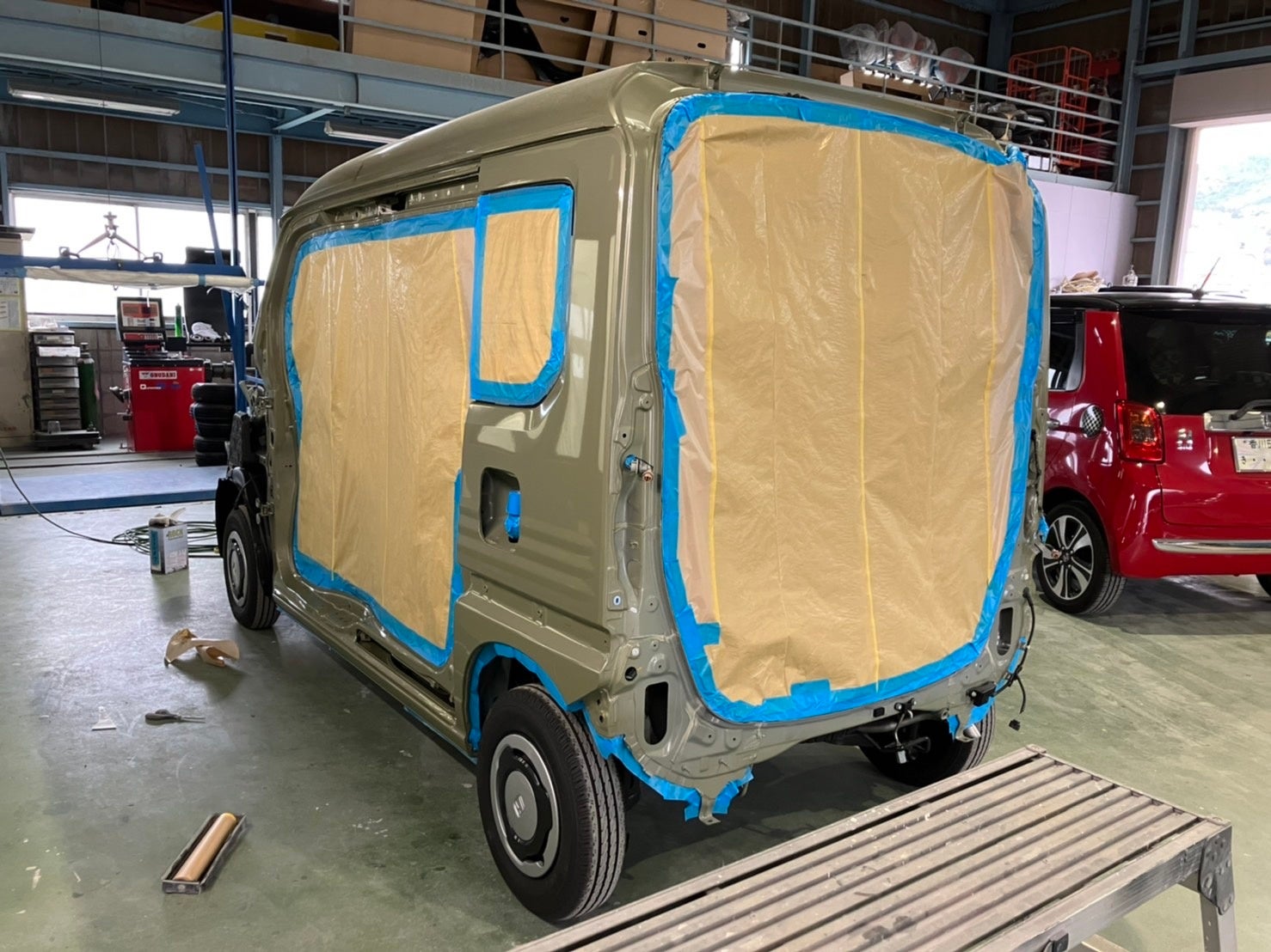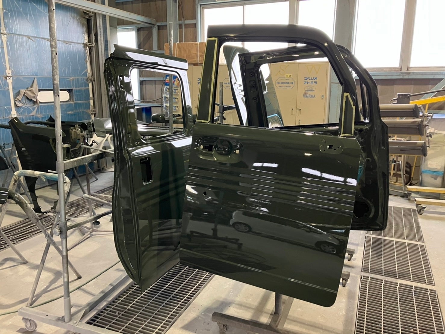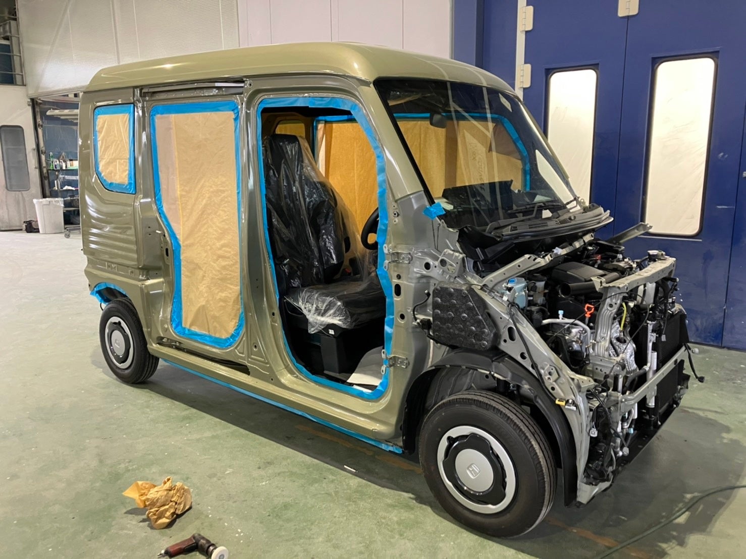 ドアやバンパーなどの車両部品を外し、外装を塗装中のmobica車両