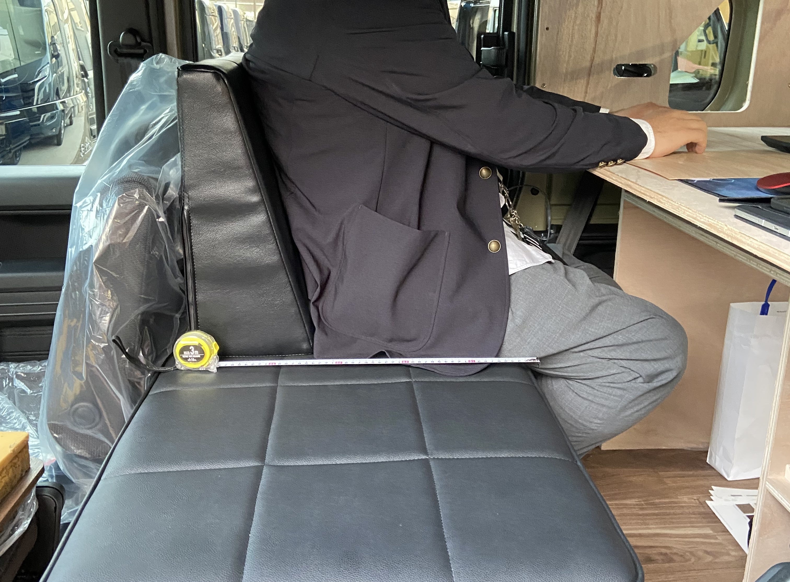 仕様検証のために、モックアップを製作。実際に荷物を置いたり着座したりしながら使い心地を確認しています。