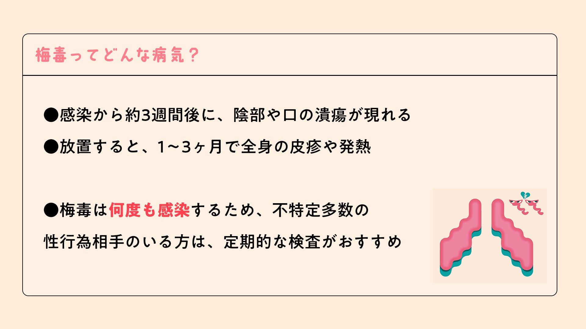 梅毒は、菌を排出している感染者との粘膜や皮膚の接触を伴う性交渉時に感染します。