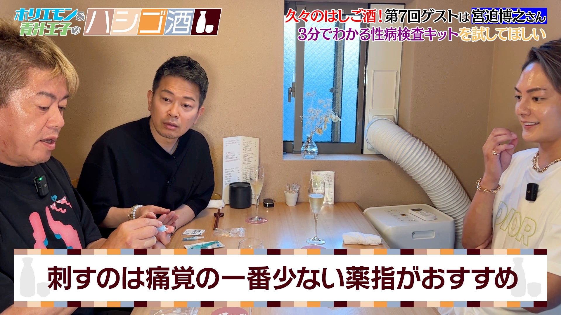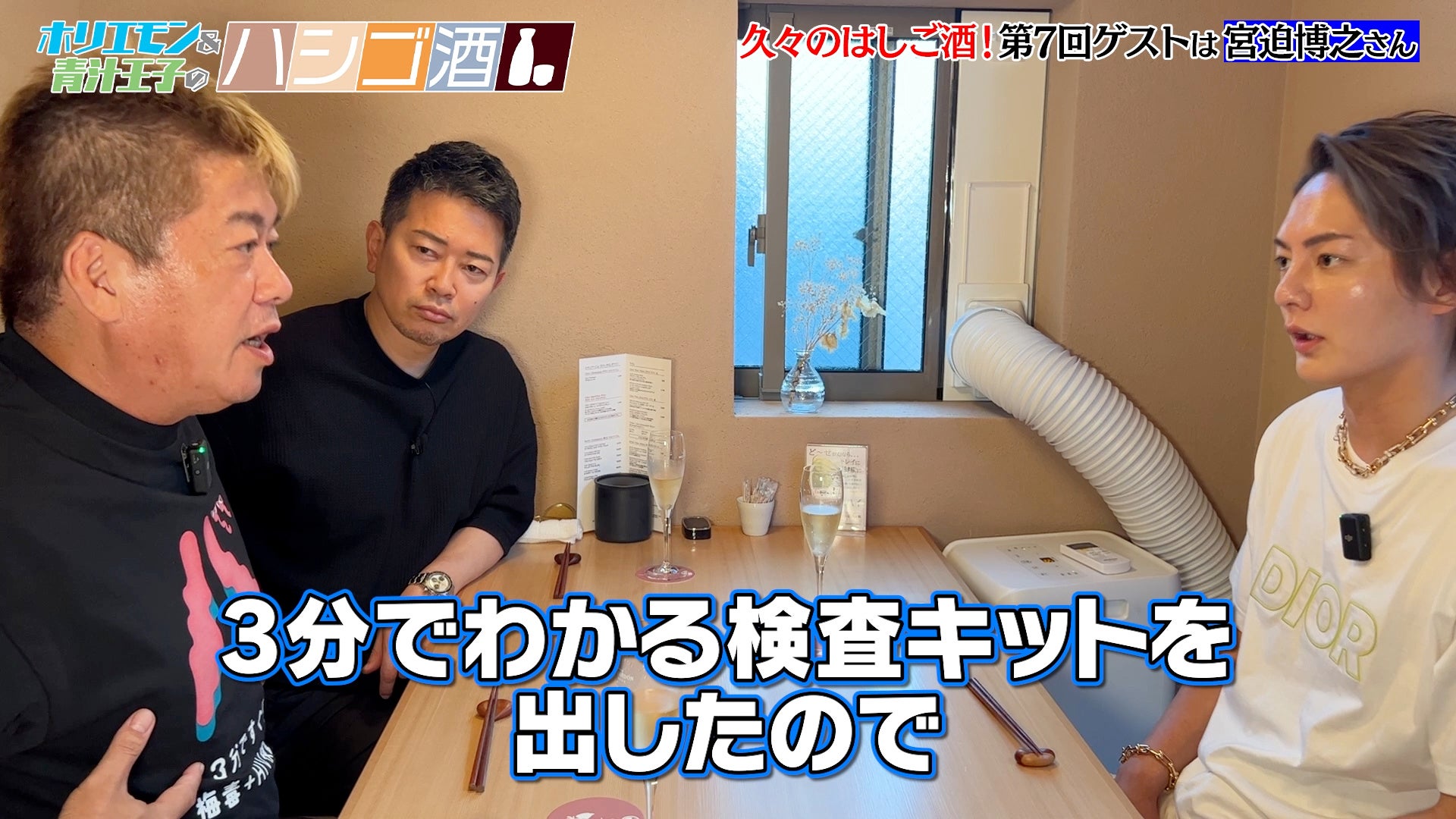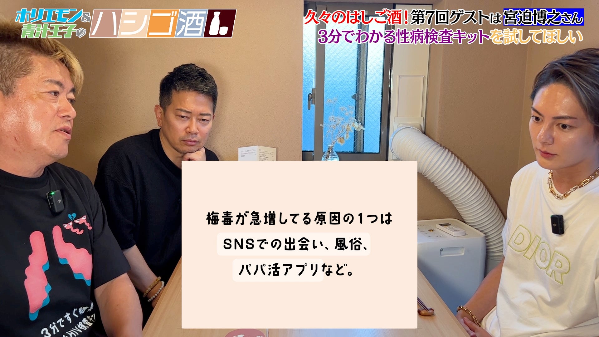 協会理事 堀江貴文氏と、実業家 三崎優太さんとともに「梅毒」をテーマにしたYouTube動画を公開しました。特別ゲストとして宮迫博之さんも参加し、見慣れない堀江さんのTシャツに対する三崎さんからのツッコミからスタート。実際にその場で検査キットに挑戦し、堀江さんは「めっちゃ早く結果がでますね。陰性だと安心しますよね。」とお手本をみせて、宮迫さんも「感染していない自信はあったけど、ドキドキする。梅毒がいまそんなに感染者が増えているとは知らなかった。」とコメント。無事陰性であることを確認し、万全の状態でハシゴ酒企画を進行していきました。