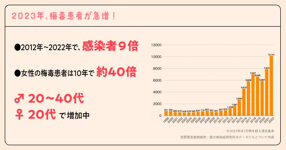国立感染症研究所が発表している調査によると、国内における梅毒の感染者数は2012年から2022年でおよそ9倍にも増加しており、特に女性の感染者数は10年で40倍にも増加しています。また、今年の感染者数はすでに約7,500人(7月5日時点)と、現在の統計の方法で計測をはじめてから最多であった昨年(1万2966人)を上回るペースで増加をしており、対策が急務となっている状況です。
