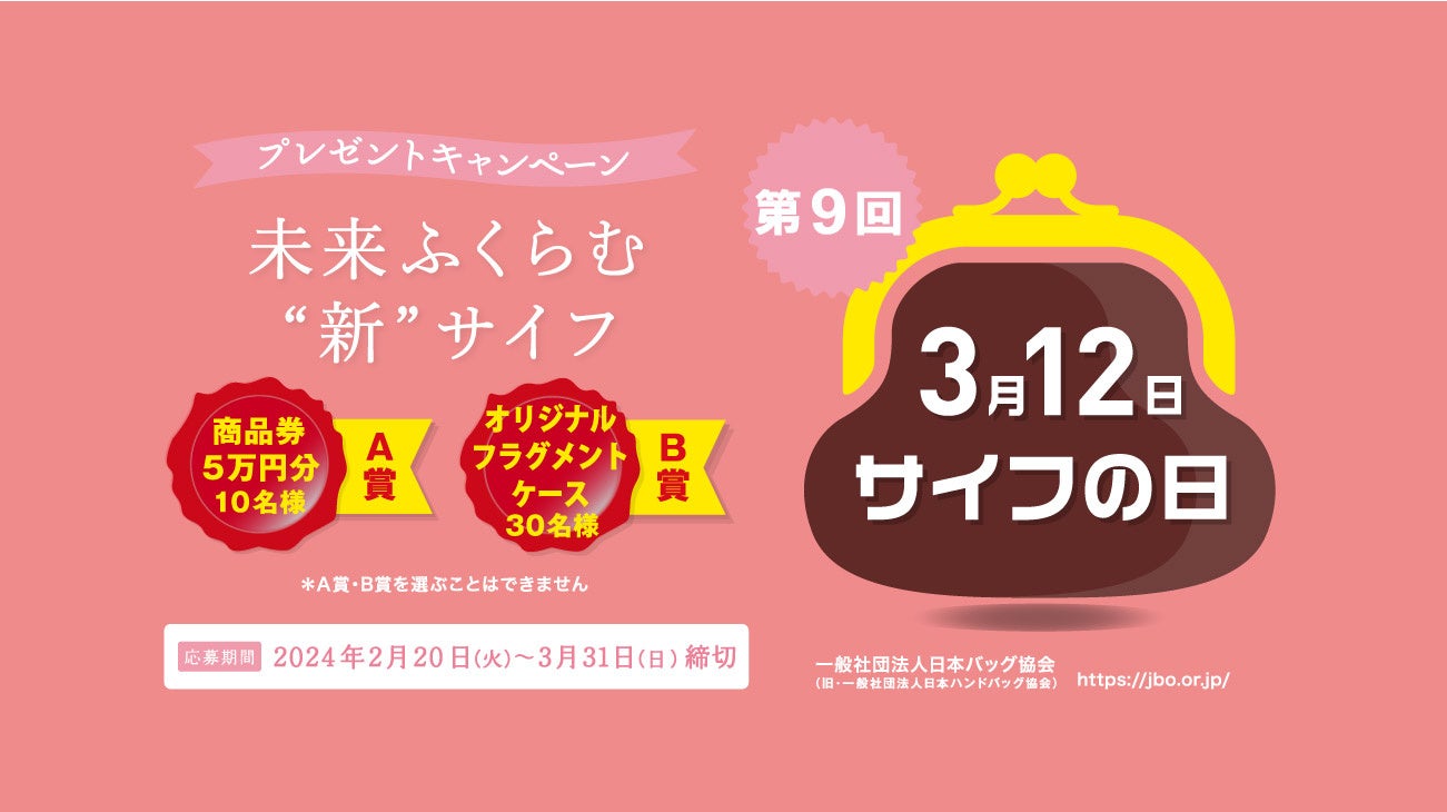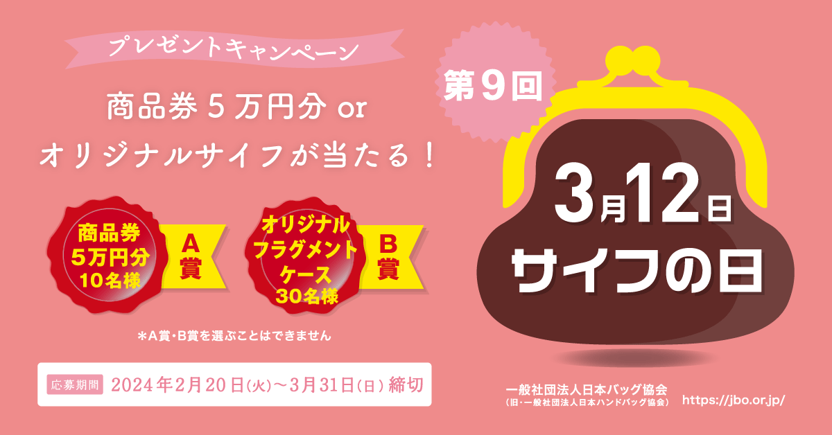 一般社団法人日本バッグ協会の主催により、3月12日の 『サイフの日』 を記念し、アンケートにご協力いただきました方の中から抽選で豪華賞品が当たるプレゼントキャンペーンを本年も開催しております!