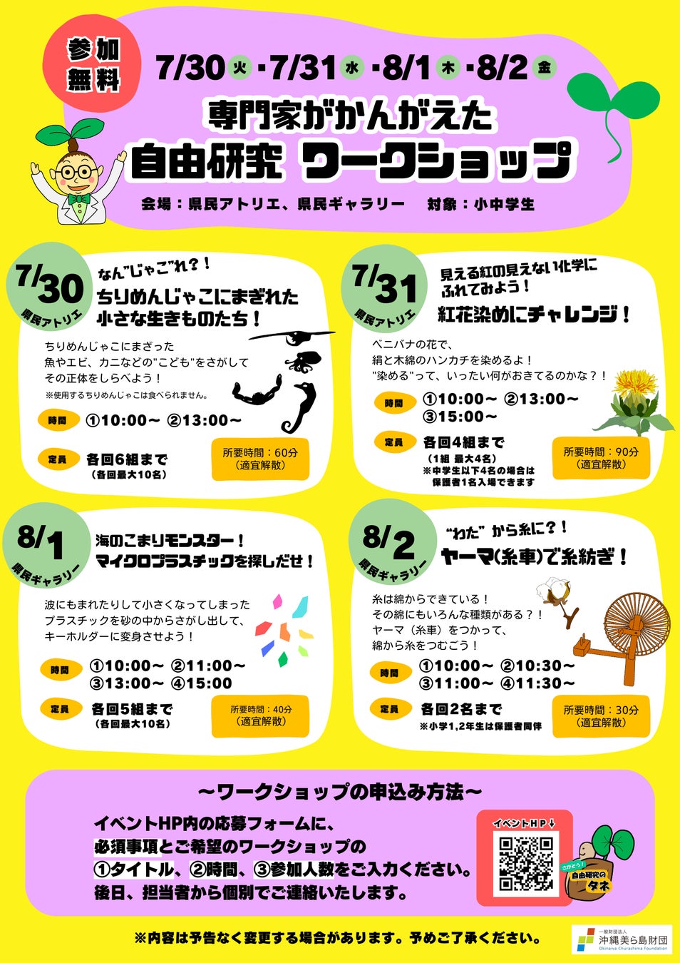 (一財)沖縄美ら島財団 総合研究所が調査研究に取り組む、沖縄の海・植物・文化の「ふしぎ」や「魅力」をパネルや標本を使って紹介します! また、平日限定で「専門家がかんがえた自由研究ワークショップ」を開催! 今年は「紅花染め」「稚魚の観察」「糸紡ぎ」「マイクロプラスチックを使った工作」の4つの内容を日替わりで実施します。 ココでしか体験できない内容もあり、ドキドキワクワクなワークショップです。(※要事前申込) |