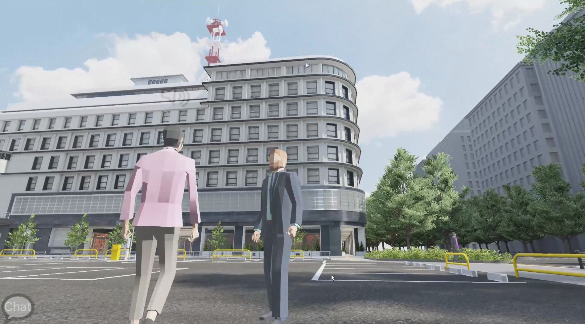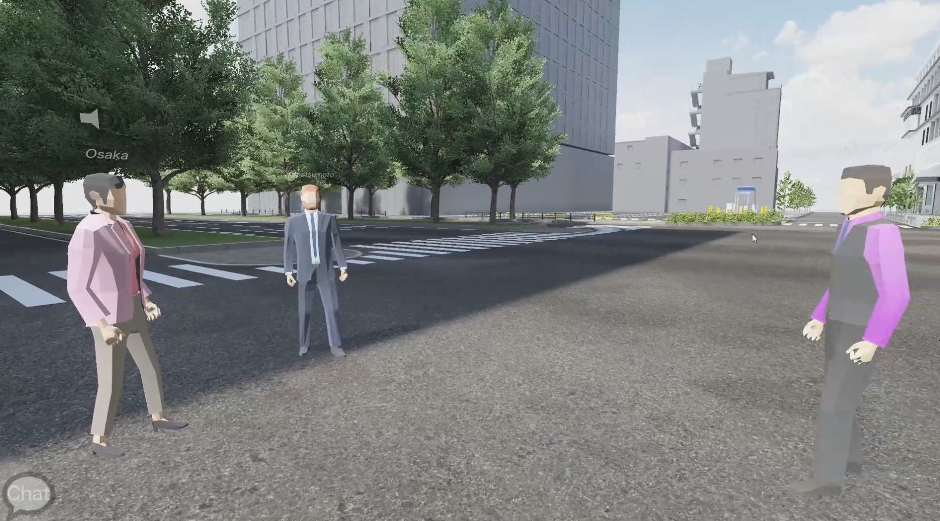 今回のメタバースでは、複数人が同時にアバターとなりメタバース空間内で、コミュニケーションを実施する事が可能となっています。ボイス・テキストチャットに対応し、臨場感のある空間内でのマルチプレイを実現しました。遠隔地より接続した仲間とリアルに構築された御堂筋に立ち、大阪瓦斯ビルディングを見上げる、御堂筋の中央で会議をするといった現実には実現不可能な体験を提供します。