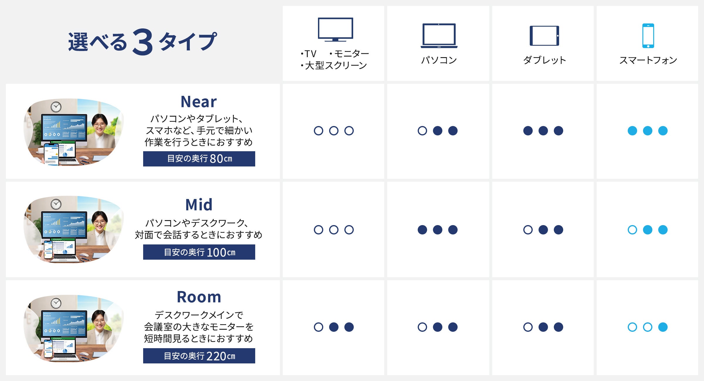 〇姿勢と視線移動が快適!デジタルデバイスの距離や角度に対応した3タイプの新設計
