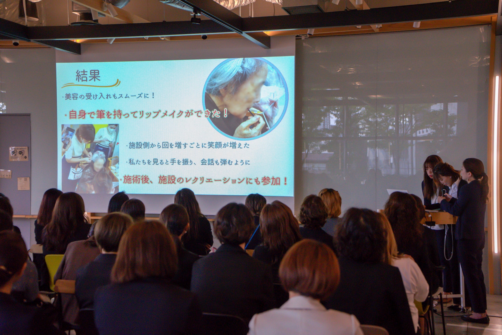 ケアビューティーコースの 1 年制(ケアビューティーマイスター専攻)を修了した受講生が、高齢者施設での現場実習(アセスメントプロジェクト)を通じて得た介護美容の身体的・精神的な効果をプロジェクトの集大成として発表します。