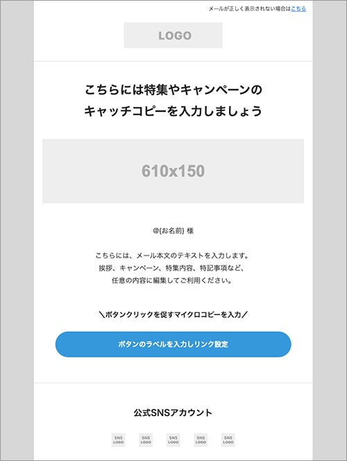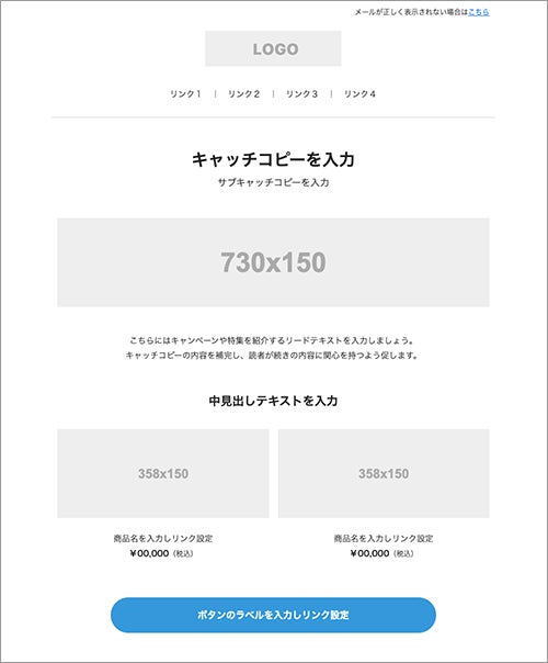 実店舗への集客を目的としたキャンペーン等に適したテンプレートです。一点集中型のシンプルかつ効果的な構成が特徴です。