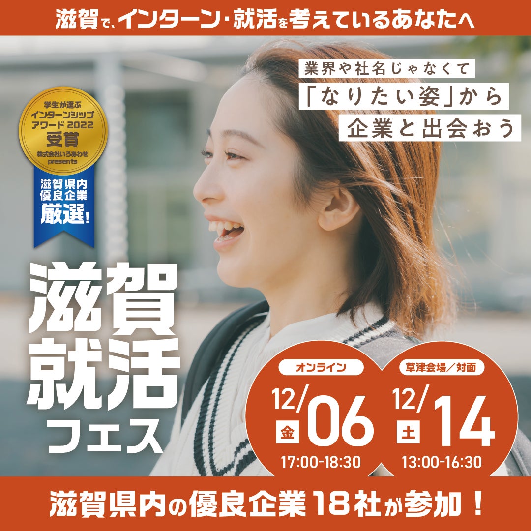 2024年12月にも滋賀県にて就活イベントを開催予定。12月6日(金)17:00〜18:30にオンラインで開催、12月14日(土)13:00〜16:30にはキラリエ草津で開催。この冬のインターン・選考情報が、その場で聞ける就活準備にぴったりのイベントとなっている。