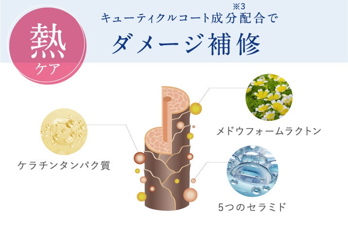 キューティクルコート成分*³配合で、タンパク質を補給しながら髪の表面をコーティング。熱ダメージを受けてパサついた髪も、うるおって手触りなめらかなツヤ髪へ導きます。