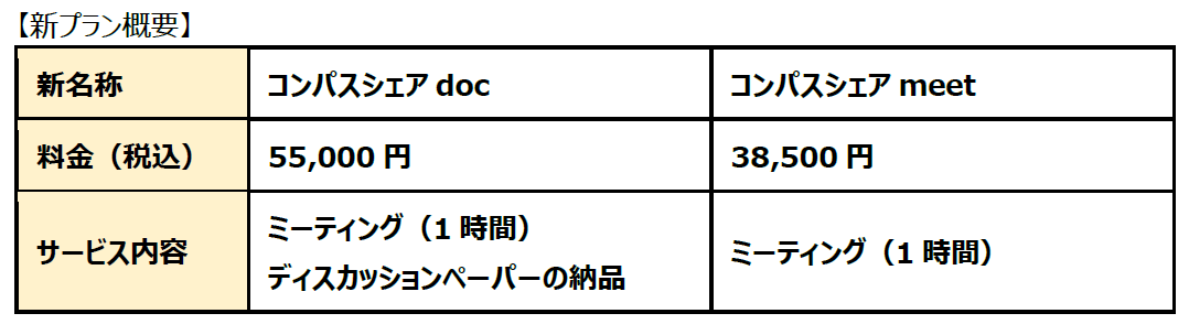 「コンパスシェアmeet」は、コンサルタントとの1時間のミーティング実施を38,500円(税込)で利用できるプランです。「コンパスシェアmeet」の提供開始に伴い、ディスカッションペーパーが納品される従来のプランを「コンパスシェアdoc(ドック)」とし、企業の皆さまは2種類のプランから用途や予算に合わせてご利用可能となります。