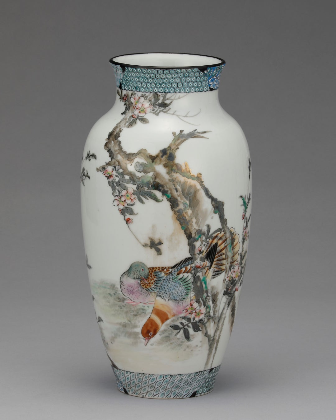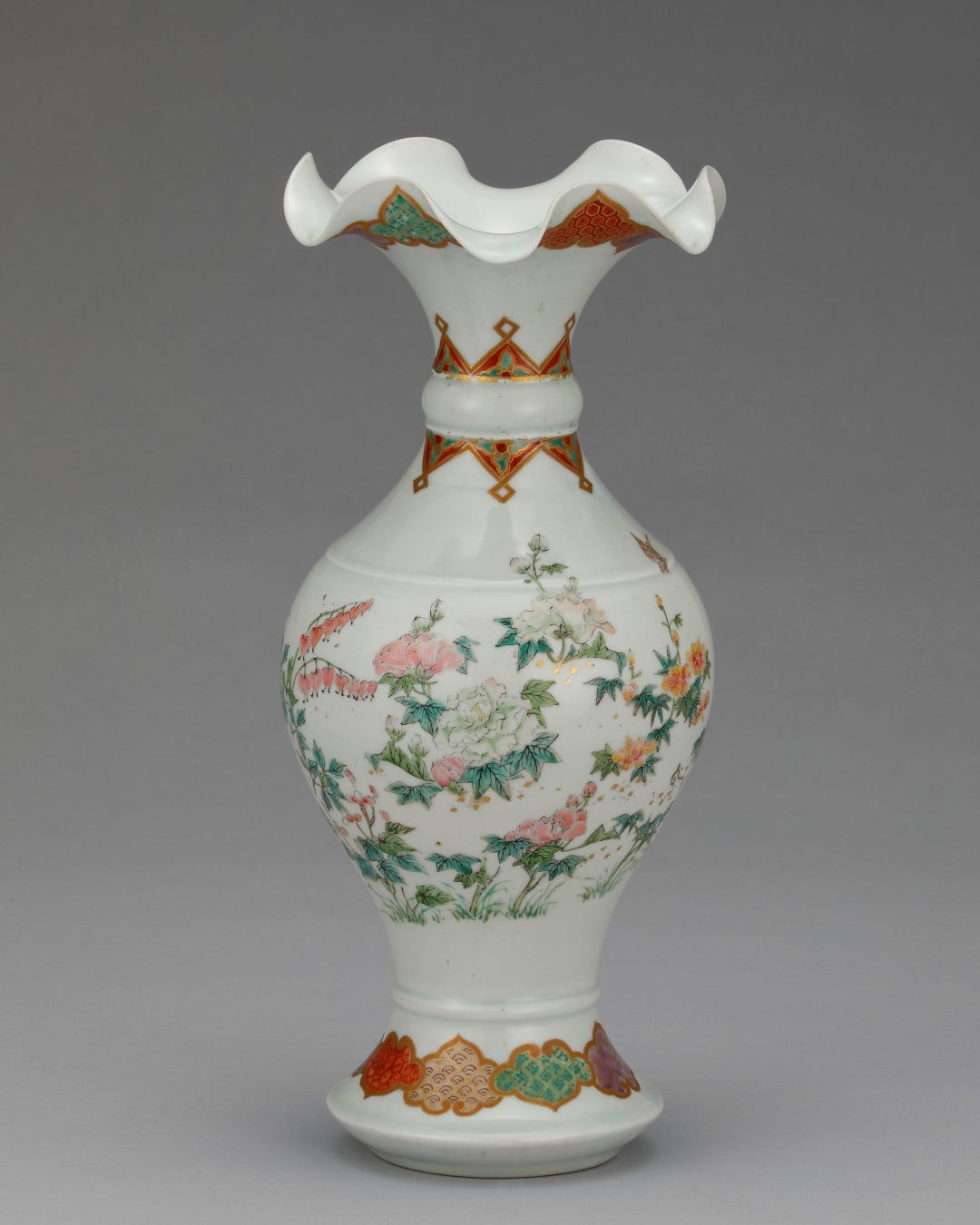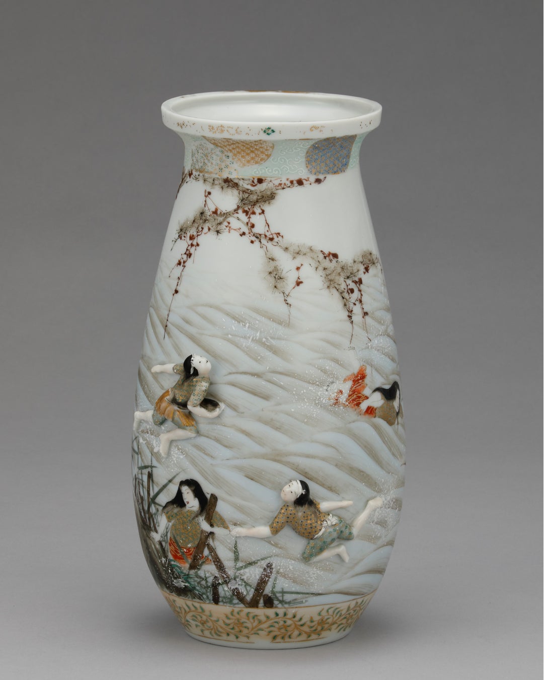 政府は明治5年(1872)、翌年にオーストリアで開催されるウィーン万国博覧会への出品物を制作するため、東京の浅草芝崎町に博覧会事務局附属磁器製造所を設立します。瀬戸や有田、京都などから素地を取り寄せて専門的に上絵付を行い、洋絵具も導入して服部杏圃などが指導しました。これが東京錦窯で、翌年に閉鎖されると河原徳立が陶画工を連れて引継ぎ、深川に瓢池園を設立して東京絵付の中心となります。東京で盛んとなった絵付業に着目した井村彦次郎は、同8年(1875)頃、専属の上絵付工場を有する陶磁器販売店を横浜の本町通に設立し、横浜港からの輸出を行いました。これが先駆けとなり、貿易港の利点を活かして田代商店など多くの業者が参入、横浜でも上絵付業が発展します。しかしその一方で、瀬戸や美濃といった産地に近い名古屋でも上絵付業が盛んになっていきました。瓢池園や田代商店などが本拠地を名古屋へ移し、成瀬誠志も生産コストの高い都会から故郷の茄子川(現・岐阜県中津川市)に戻って行き、関東大震災と戦災の打撃が重なって、東京・横浜焼は幻のようにその姿を消してしまったのです。