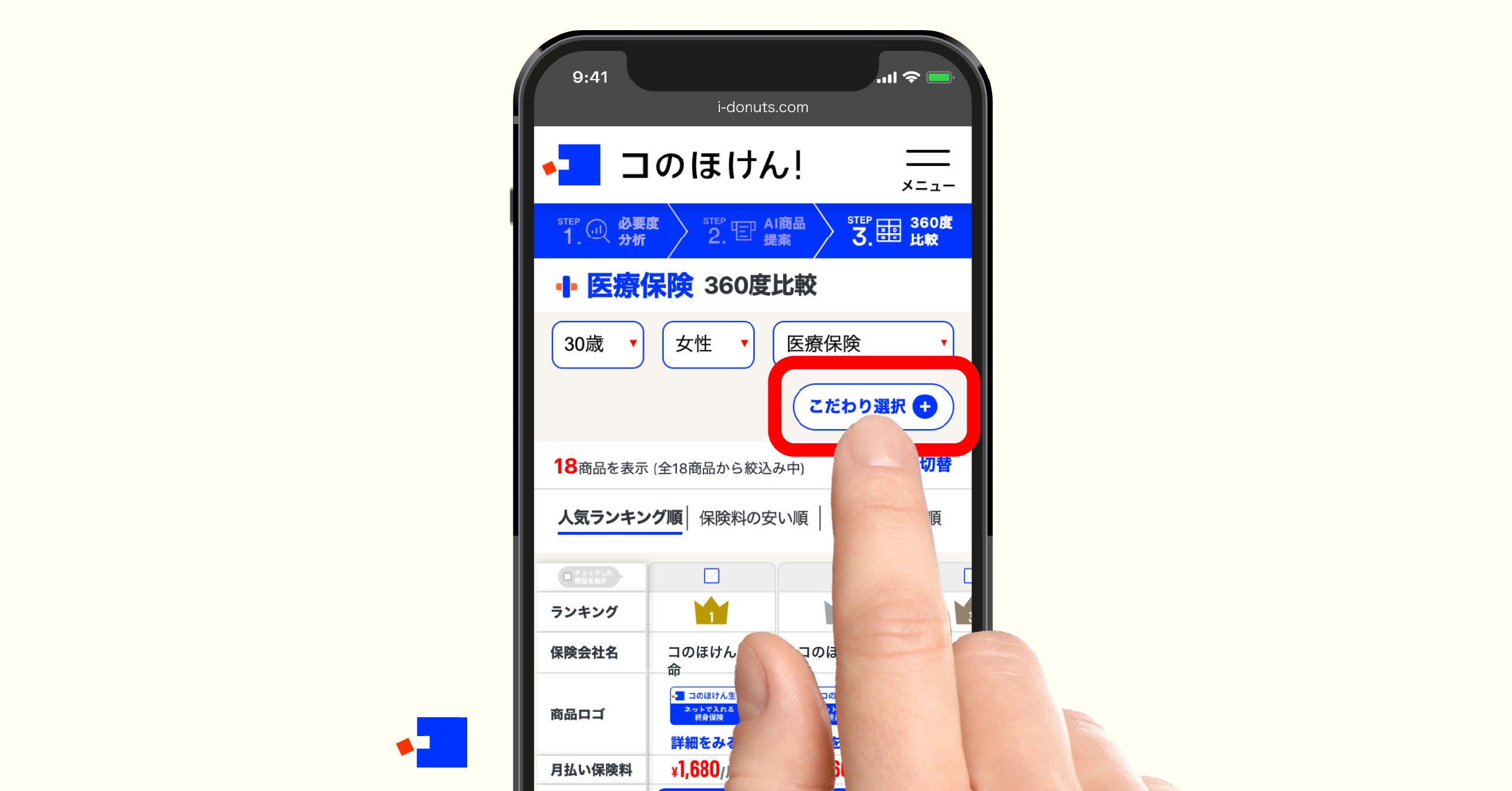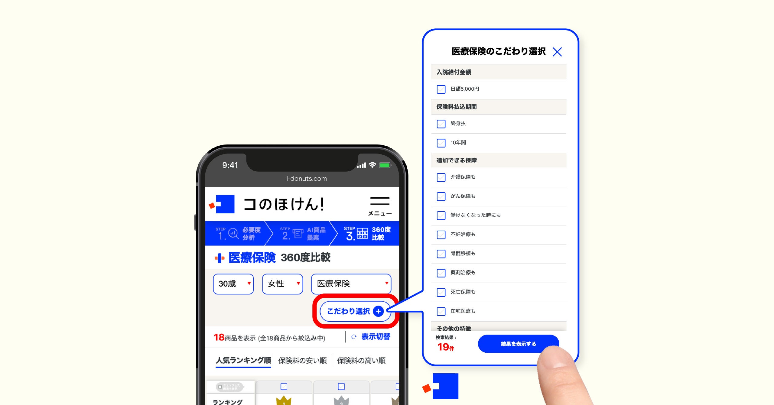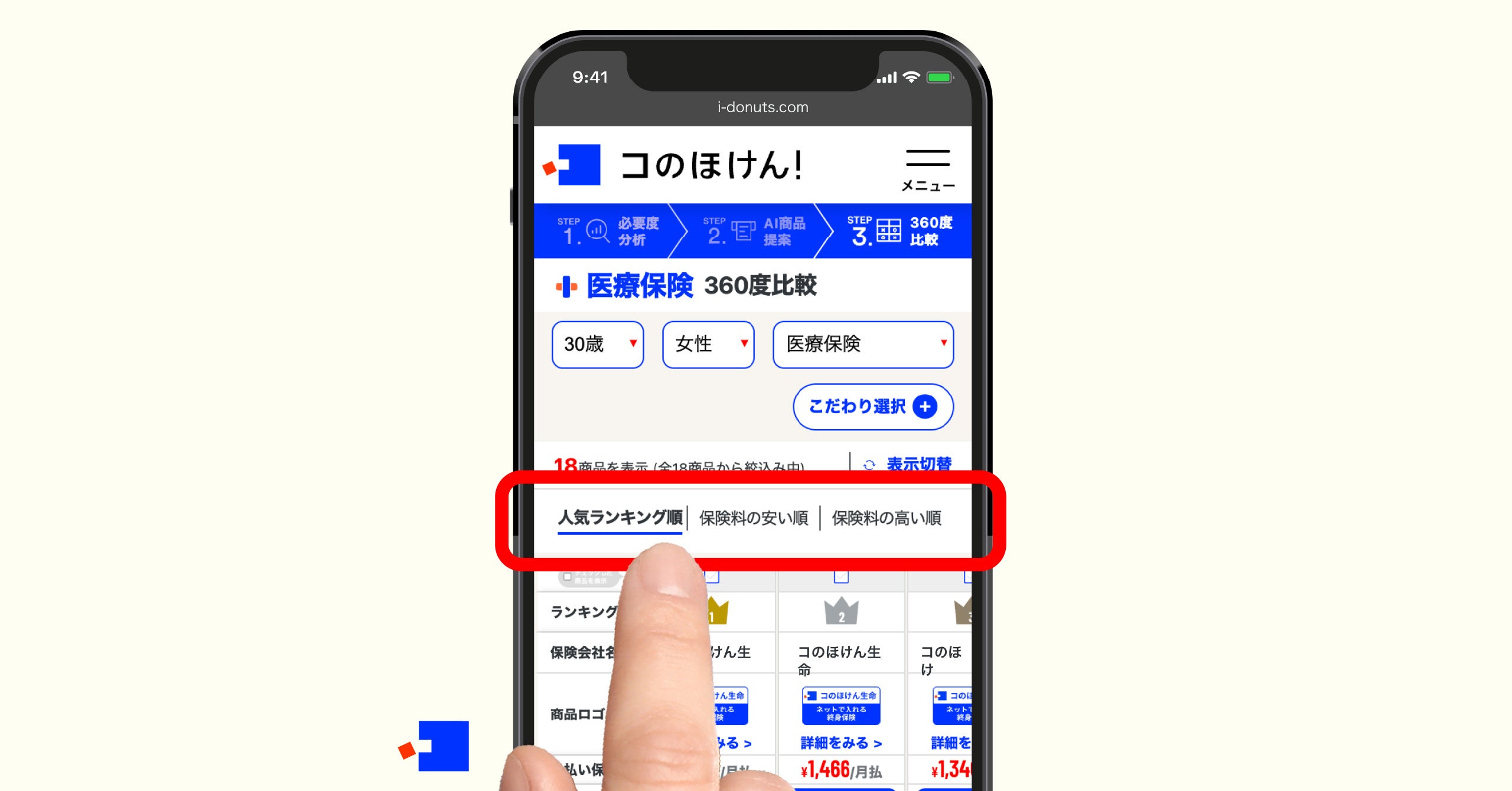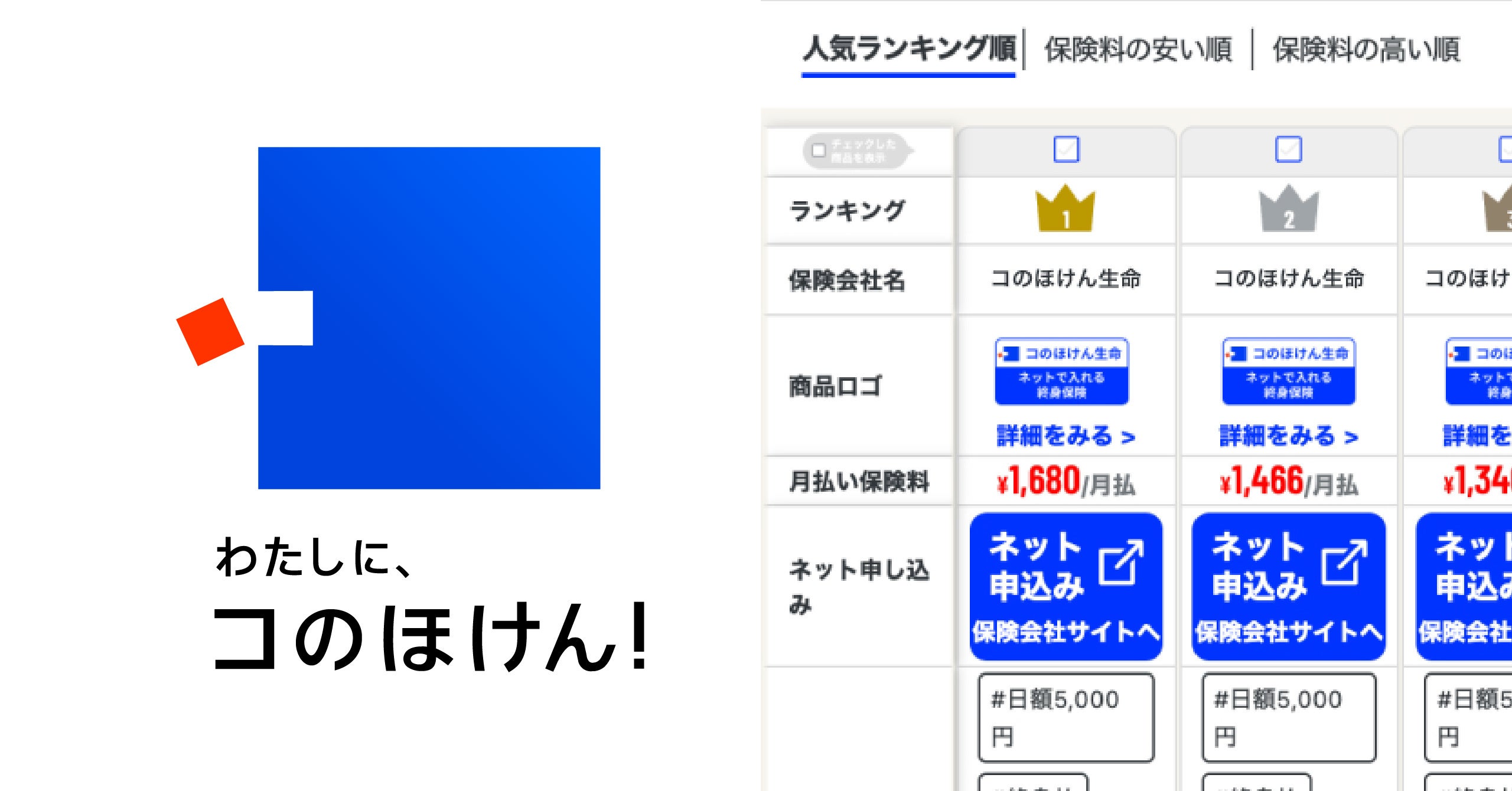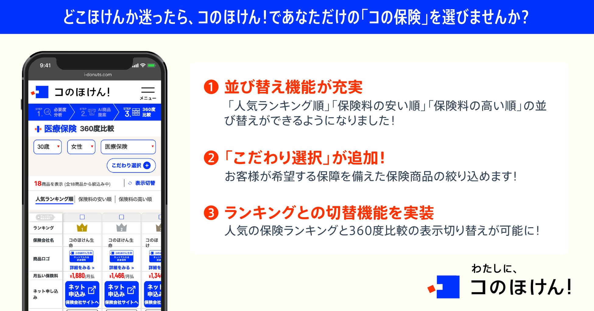 「360度比較」3つの新機能リリース!①保険商品の人気ランキング順・保険料順の並び替え、②こだわり選択で絞り込み、③ランキングとの切り替え、が可能に!保険の診断・比較・見積もりサイト「コのほけん!」