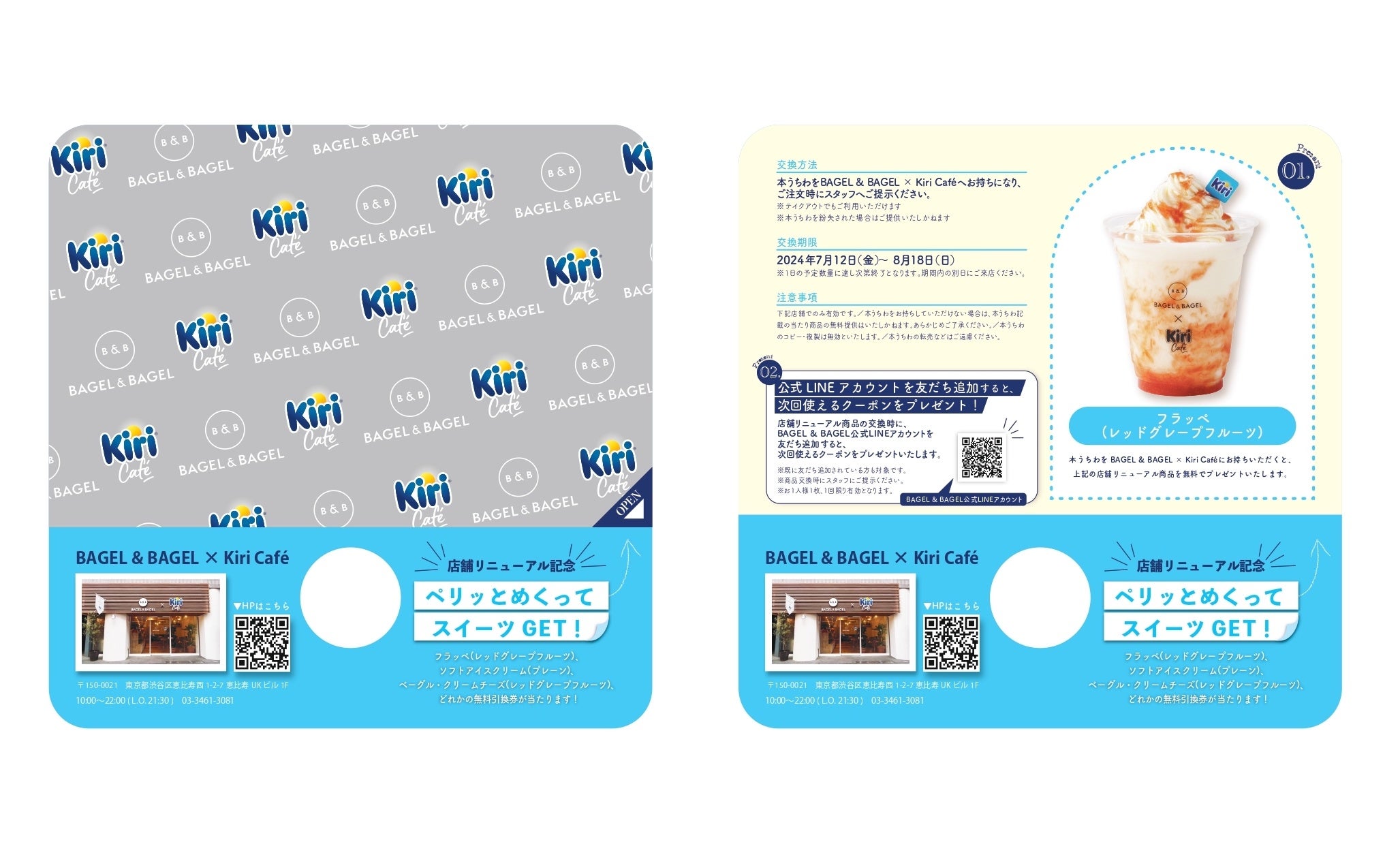 リニューアルオープンにともない、新メニューをお試しいただける数量限定無料サンプリングを実施します。「キリ クリーミーポーション」の包み紙をイメージしたうちわ型のサンプリング券「キリ“ぺりっ”とうちわ」を、7月12日(金)〜7月14日(日)の3日間限定で、JR恵比寿駅西口前で配布。包み紙をめくる感覚でうちわのシール部分をめくっていただくと、新メニューの「キリ クリーミーチーズソフトクリーム」、「キリ クリーミーチーズフラッペ ‐レッドグレープフルーツ‐」、「レッドグレープフルーツディップ(ベーグル付き)」のいずれかを無料でもらえるサンプリング券になっています。サンプリング券は、7月12日(金)〜8月18日(日)まで、BAGEL & BAGEL × Kiri Caféにて、商品と交換することができます。