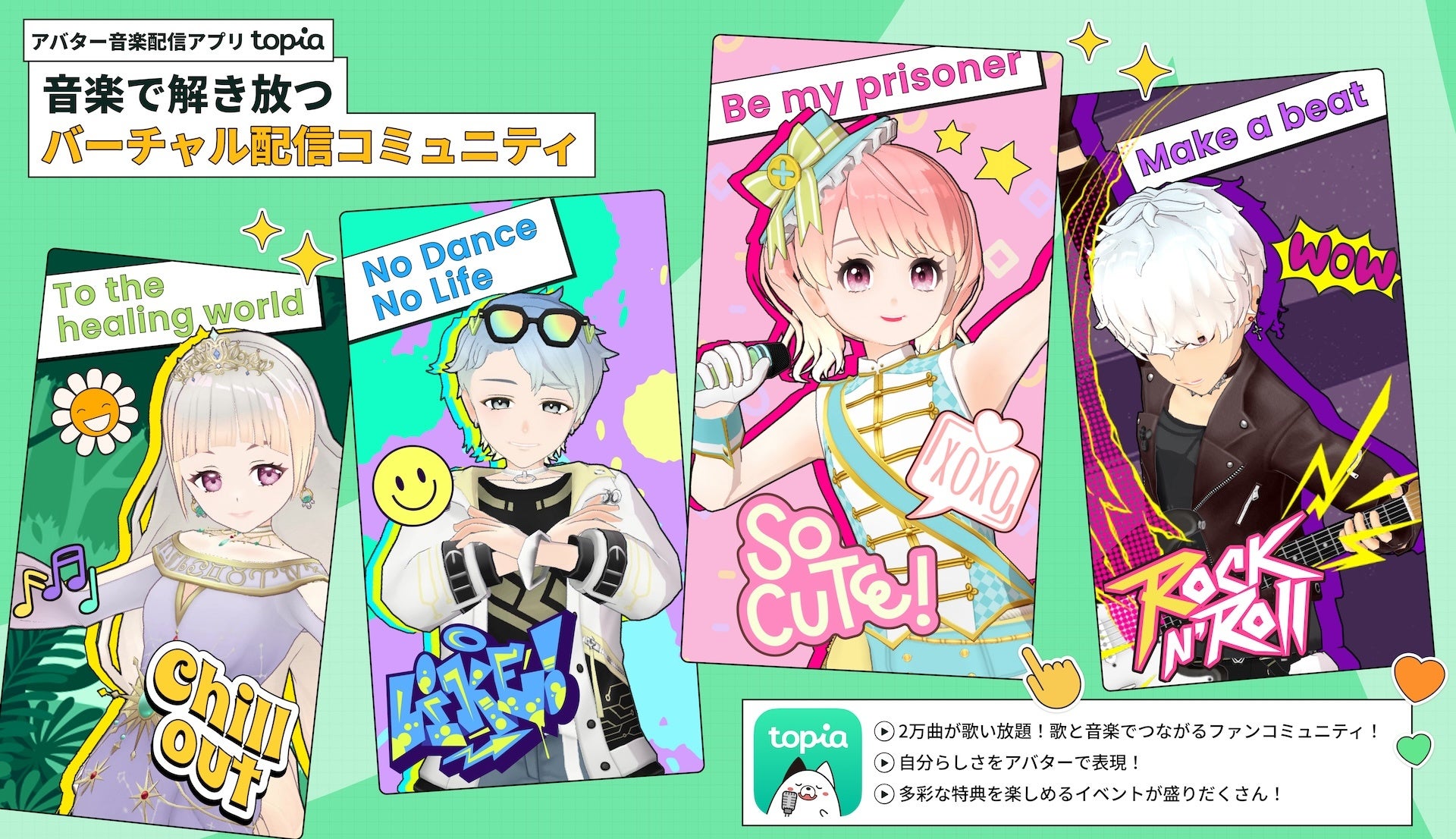 topiaは、毎日2000人以上の個性あふれるVライバーたちが歌配信しているスマートフォンアプリです。Vライバーとリスナー(視聴者)が、コメントやコラボ通話、歌のリクエストを通じて、ゼロ距離のコミュニケーションを一緒に楽しめます。