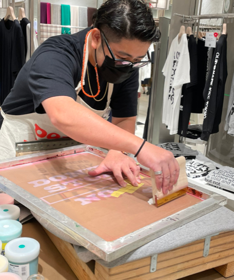 銀座ロフト3階にて「KISS,TOKYO ファッションと東京と。」コーナーの商品に、チャーリートーキョー職人のアシストでカスタマイズできます。シルクスクリーンプリントか刺繍をお選びください。