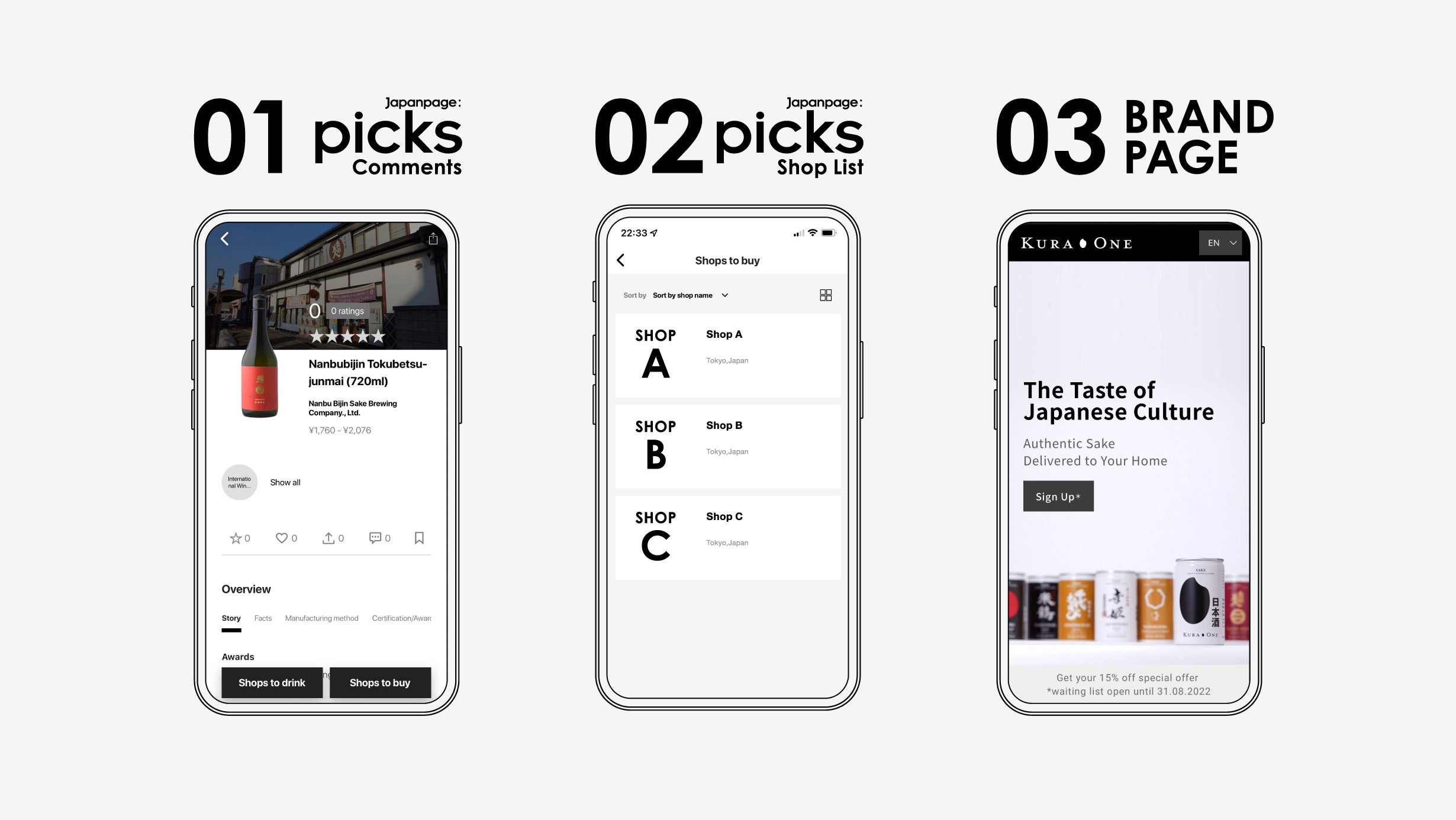 KURA ONEは、同社が近日公開するベータ版スマートフォンアプリ (Japanpage:Picks) と連携し、日本酒を軸にした世界中のユーザーとのソーシャルコミュニティの形成を推進していきます。KURA ONEのアルミ缶容器には、i) 商品詳細 / 酒蔵情報 / ニュースやお知らせ、ii) 720mLを購入できるショップ一覧、iii) KURA ONE ブランドページのストーリー、へリンクするQRコードが印刷されます。商品詳細 / 酒蔵情報 / ニュースやお知らせには、「いいね」「シェア」「コメント投稿」といったソーシャル機能が搭載されています。