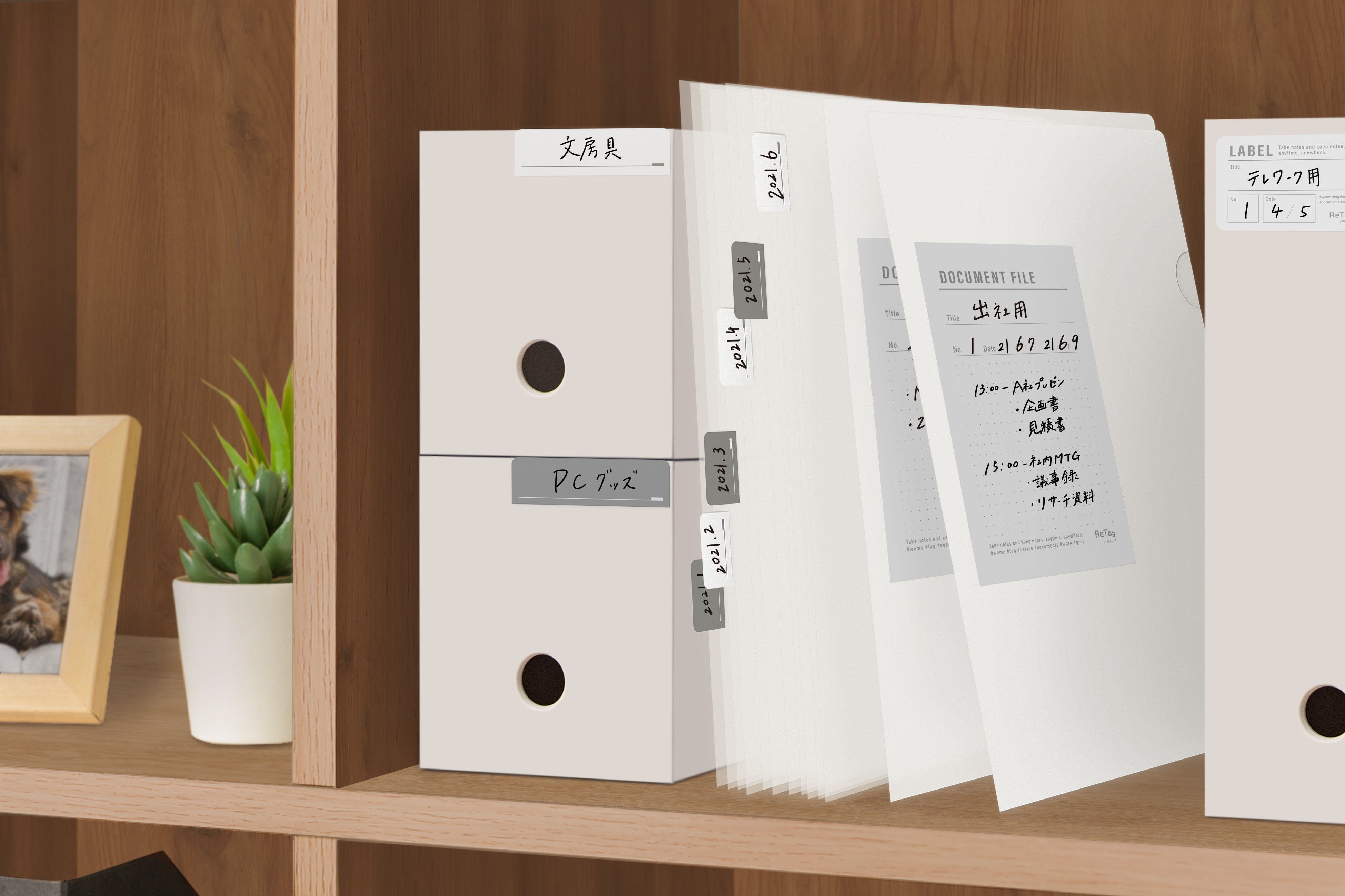 さらに、使い捨てない収納タグとして、収納に特化したタグツールブランド「ReTag®」も展開しています。見栄えを損なうことなく、収納に直接メモすることができるReTag®は、使い捨てが前提だったこれまでのタグシールの常識を覆し、何度でも書いて消せる、貼って剥がせるなど繰り返し使うことができます。