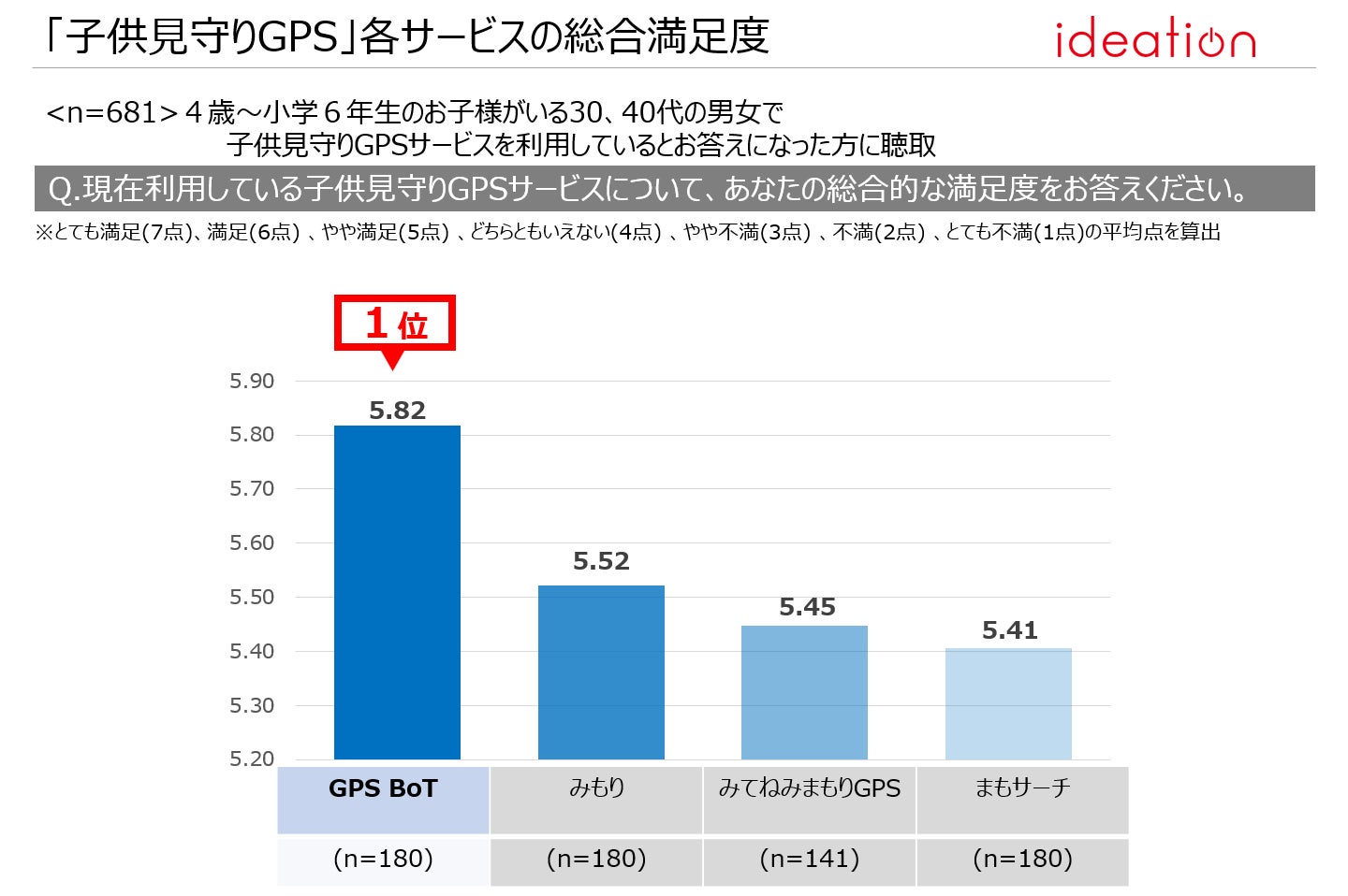 各サービスの総合満足度については、とても満足、満足、やや満足、どちらともいえない、やや不満、不満、とても不満の7段階で質問し、平均点を算出した結果、「GPS BoT」が5.82点で1位と、他サービスと比較して、満足度が高いことが見て取れる。