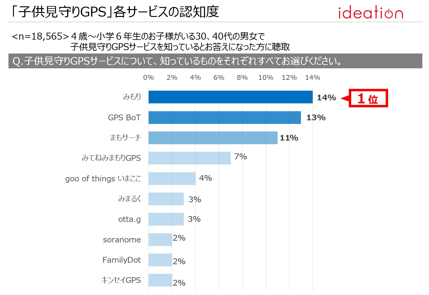各サービスの認知度は、1位が「みもり」(14%)、2位が「GPS BoT」(13%)、3位が「まもサーチ」(11%)で、上位3サービスは10%を超える認知を獲得していることがわかった。