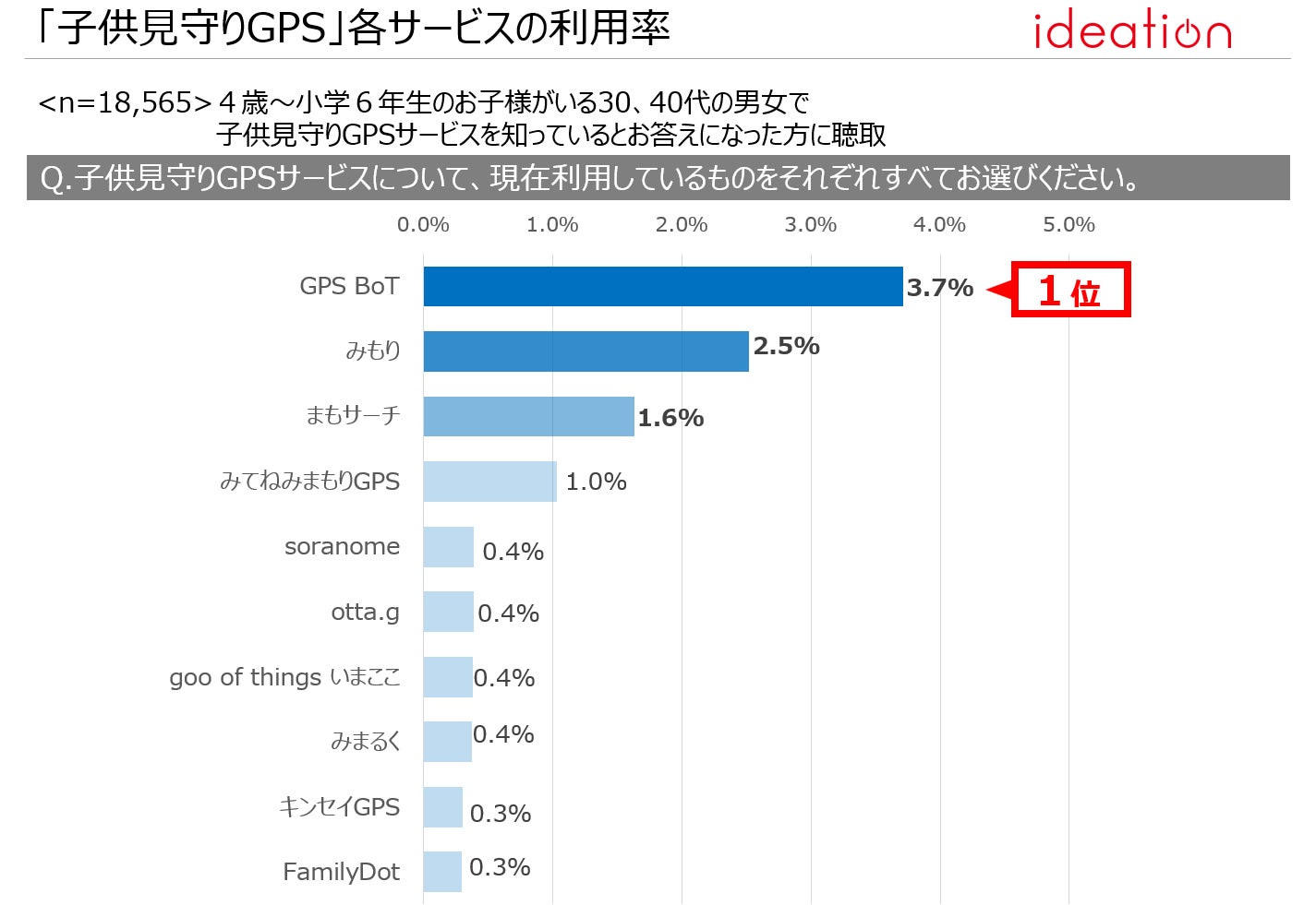 各サービスの現在利用率は、1位が「GPS BoT」(3.7%)、2位が「みもり」(2.5%)、3位が「まもサーチ」(1.6%)だった。