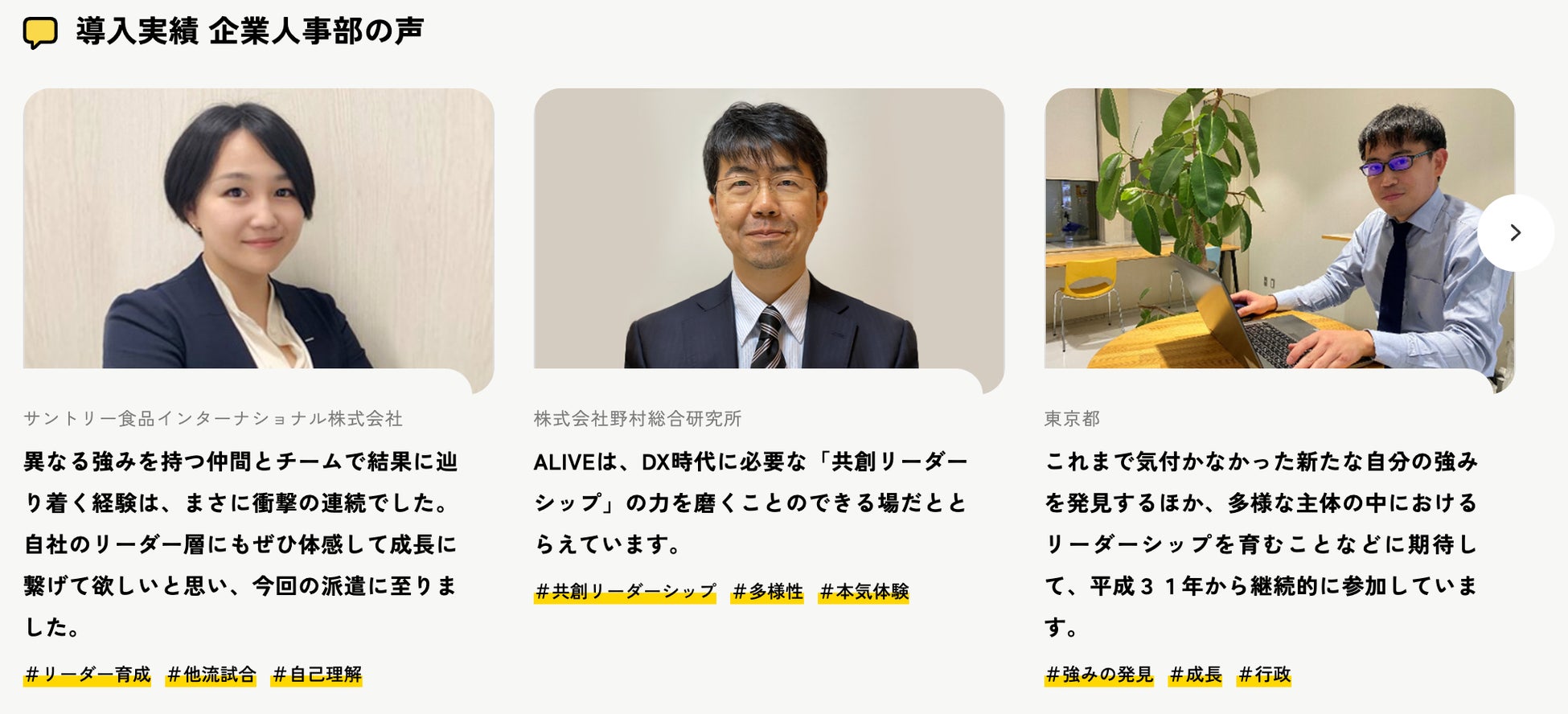 過去にご参加頂いた企業人事部の方のコメント、さらに企業から参加頂いた参加者から、実際の声を公開しています。参加ご検討の際の参考に、ご覧いただけましたら幸いです。以下ALIVEのHPよりご覧ください。