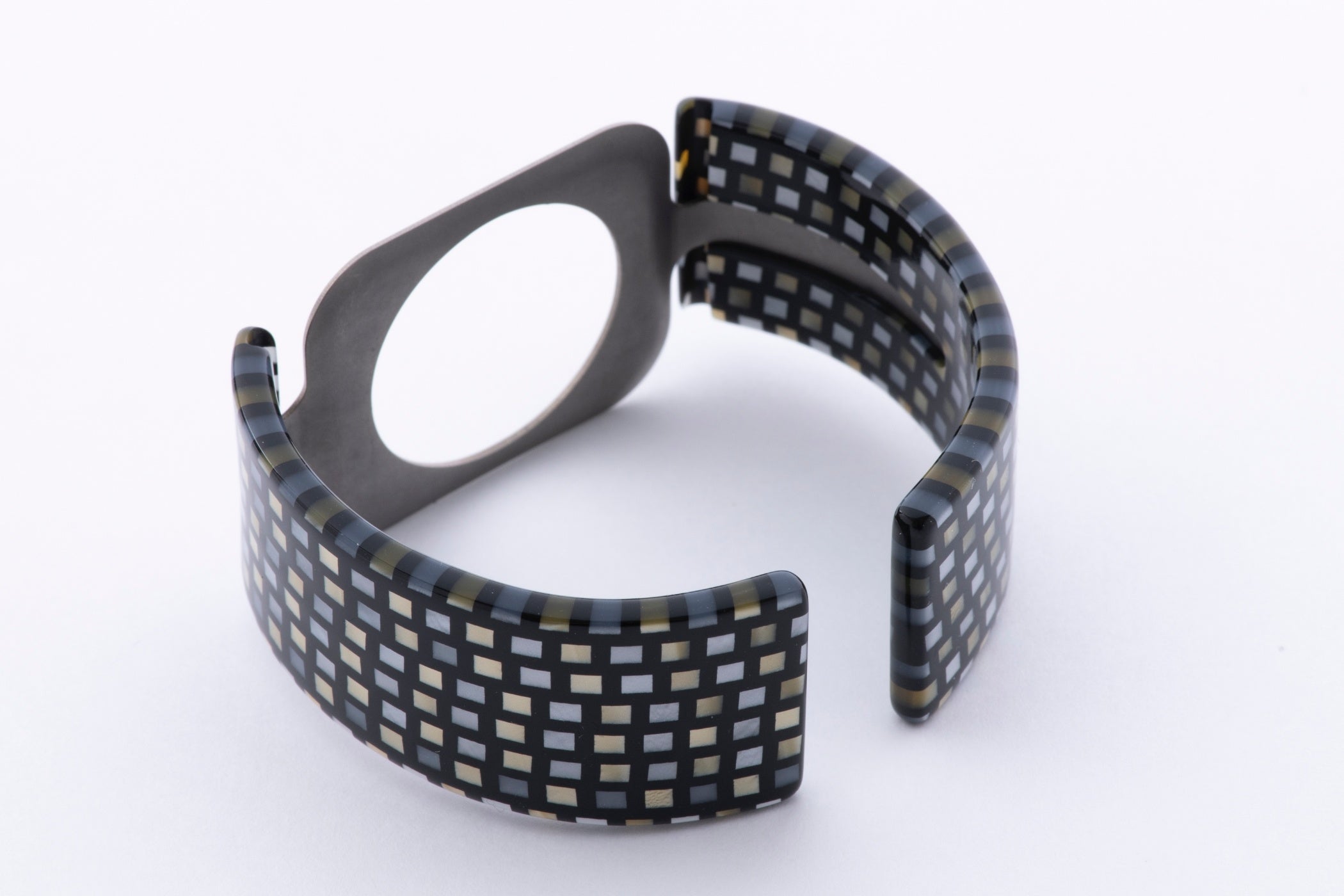 世界のトップブランドが採用するイタリアのマツケリ社製アセテートから、希少な『モザイクカラー』と『シックラデン』の意匠をセレクト。また、卓越した眼鏡づくりの技でベータチタンの厚みを調整し、バングルのサイズを細分化することで、腕へのフィット感を高めました。