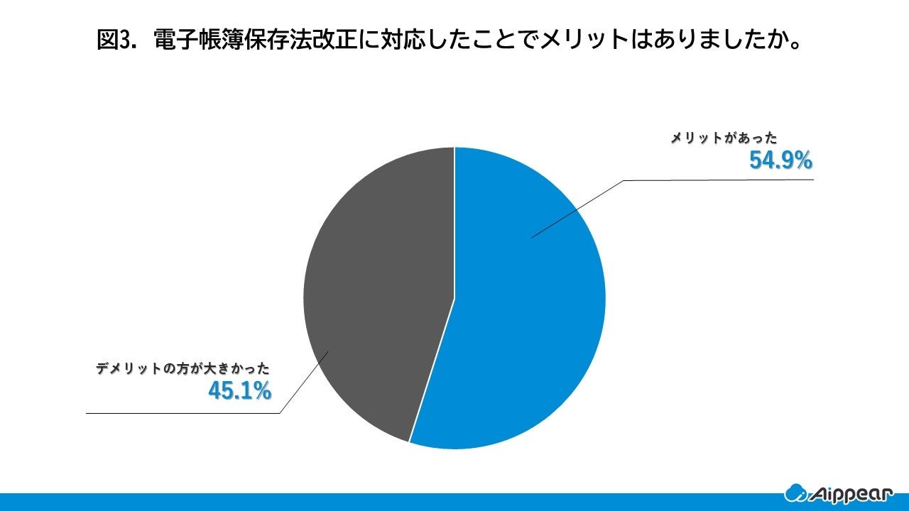 その結果、「電子帳簿保存法改正」の取り組みは45.7%、その内メリットがあったと回答したのは54.9%という結果となりました。