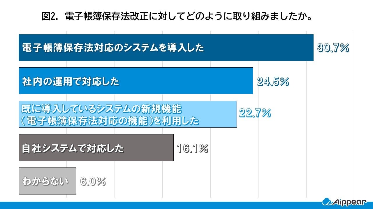 ・また、「改正電子帳簿保存法」の対応方法として最も多いのは、電子帳簿保存法対応のシステムの導入であり、30.7%(図2)。