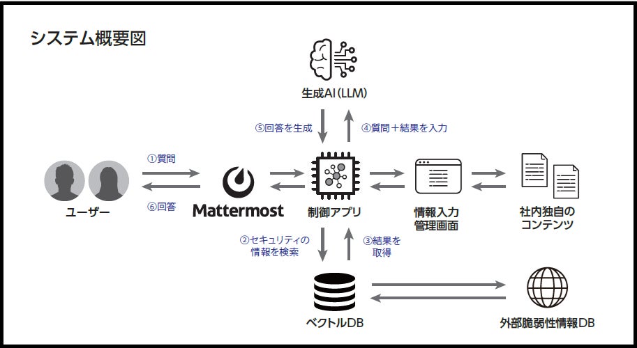 今回、このRAGのソリューションに、ビジネスチャットのMattermost(マターモスト(※2))を「社内アシスタントAI」のインターフェース(窓口)として連携しています。