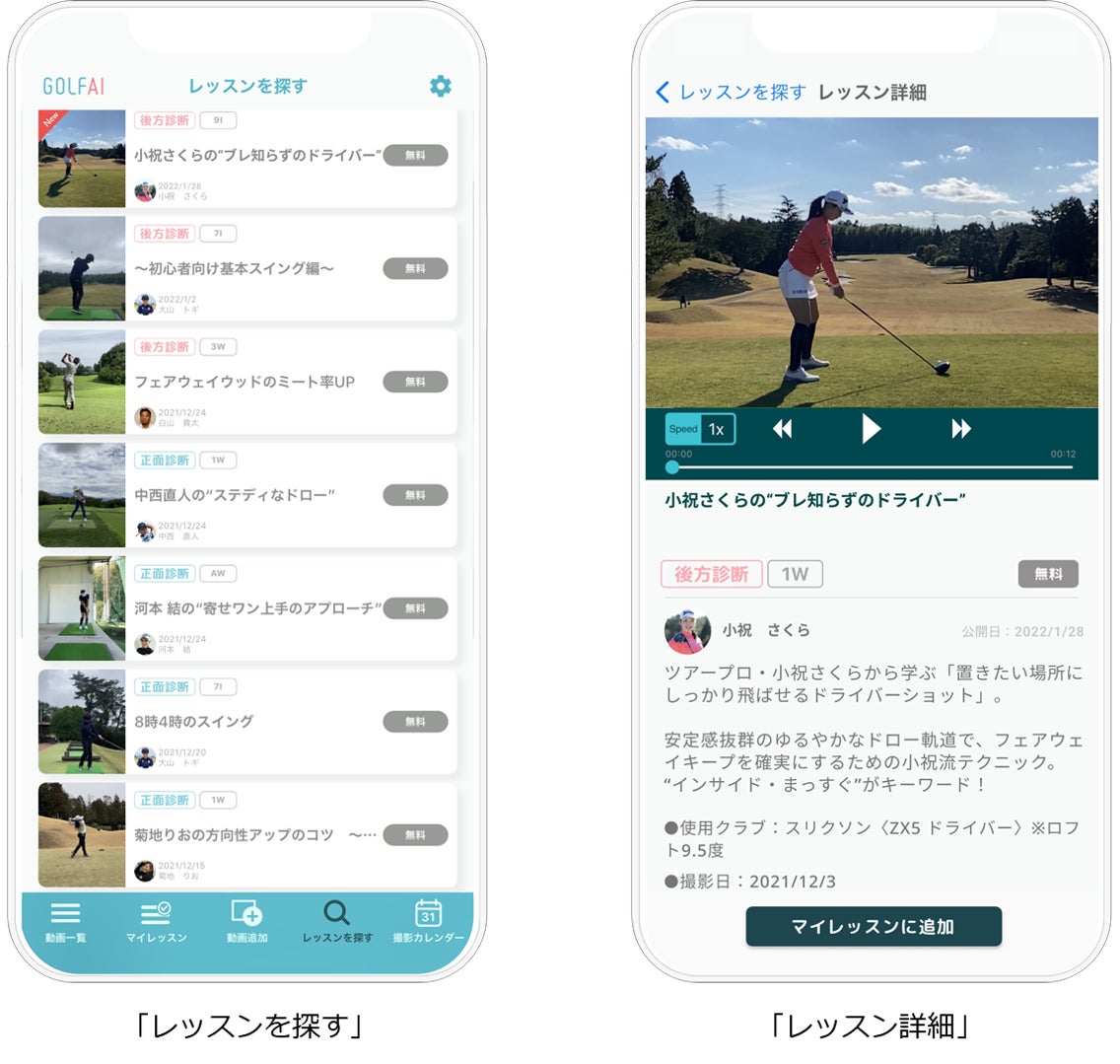 また、2021年12月には、「ドライバー以外も診断したい」「プロのスイングと比較したい」というお客さまのニーズにお応えし、さまざまな番手やショットシーンに対応する「選べるプロのレッスン」機能を追加し、現在10名以上の現役ツアープロ・レッスンプロのレッスンを配信しています。