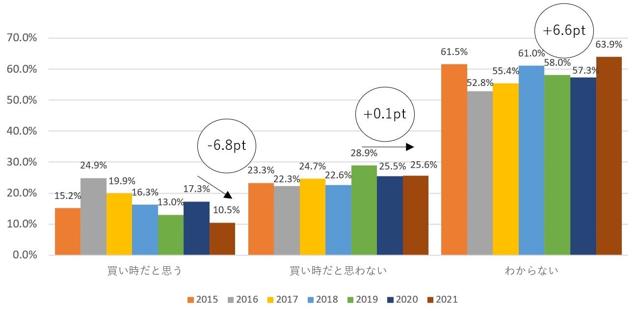 2020年度と比較して2021年度は「買い時だと思う」が6.8pt減少し、「買い時だと思わない」が0.1pt増加、「分からない」が6.6pt増加しました。