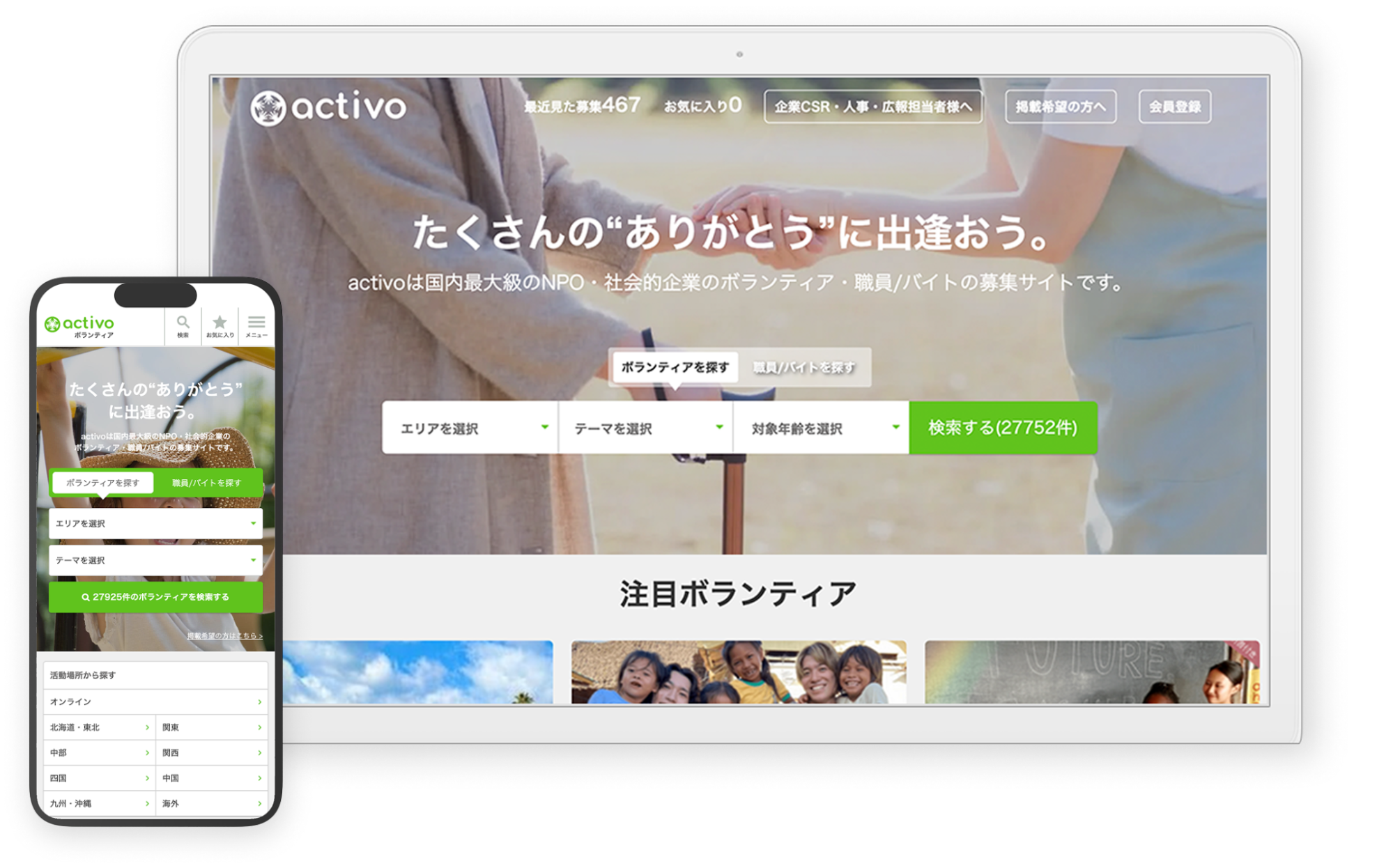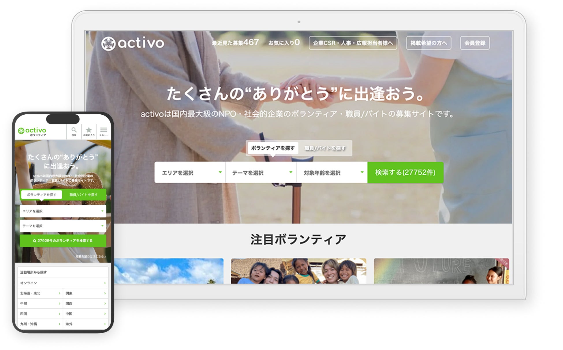「ボランティアを日常の選択肢へ。つながりを社会の力へ。」をビジョンに掲げ、「人の力を必要としている非営利組織」と、「何か力になりたい個人」をつなぐ国内最大級のボランティア募集情報サイト「activo(アクティボ)」を運営しています。