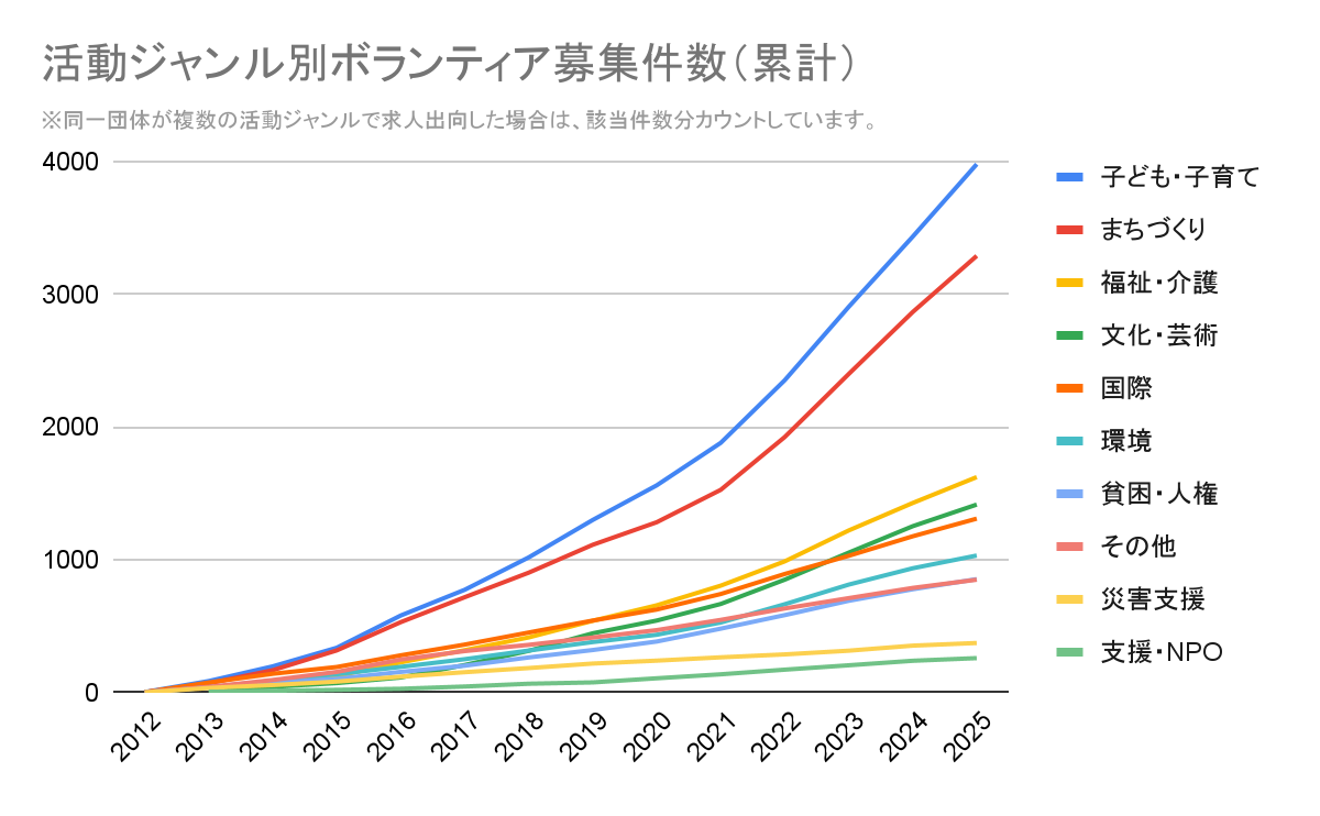 団体の活動ジャンルごとのボランティア募集件数をみると、圧倒的に多いのが「子ども・子育て支援」で、10年前の2015年当時累計337件だった子ども支援系のボランティア募集件数は、2025年には3,986件と11.8倍に増加しています。