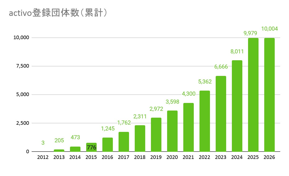 2013年1月に、ボランティアを募りたい非営利団体と、ボランティア活動に参加したい個人をつなぐボランティア募集情報サイト「activo」を公開して以来、activoに登録する非営利団体の登録数は右肩上がりに増加。約10年前と比較(※1)すると12.9倍に増え、2026年1月12日で、登録団体数は1万件を突破いたしました。