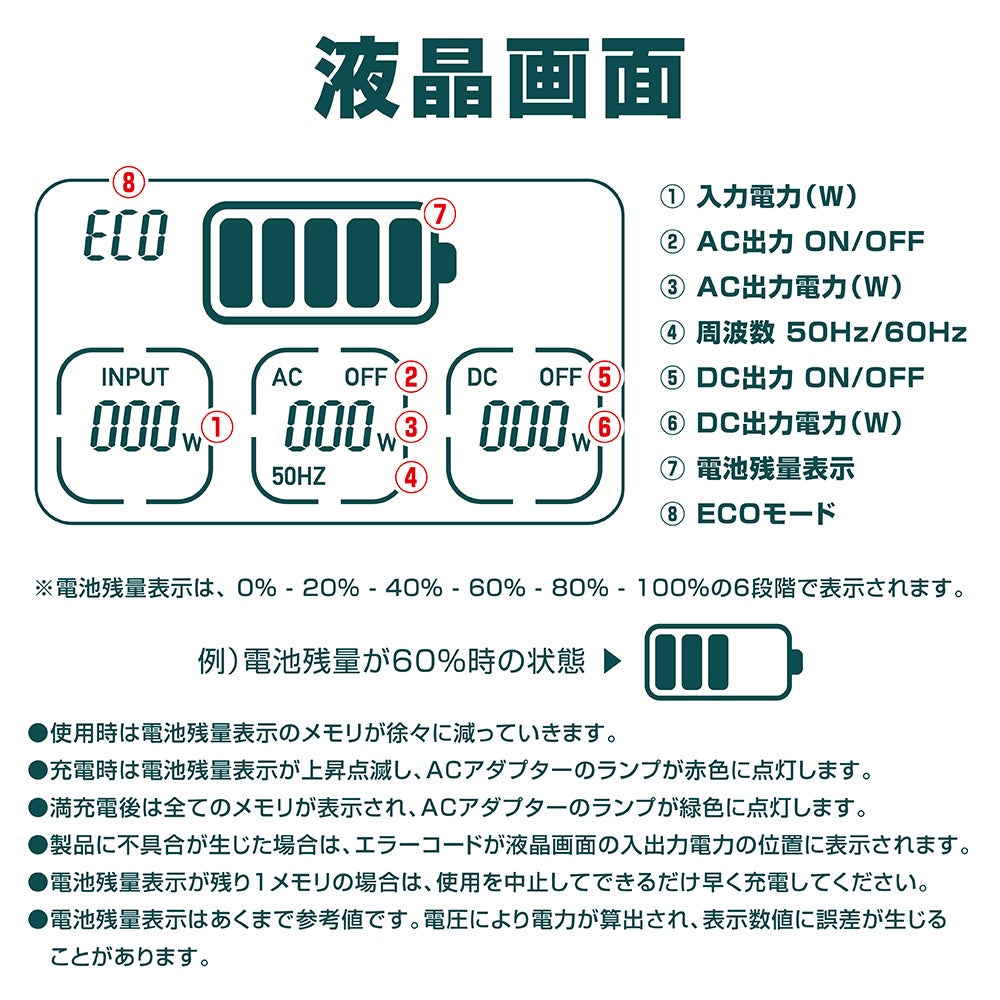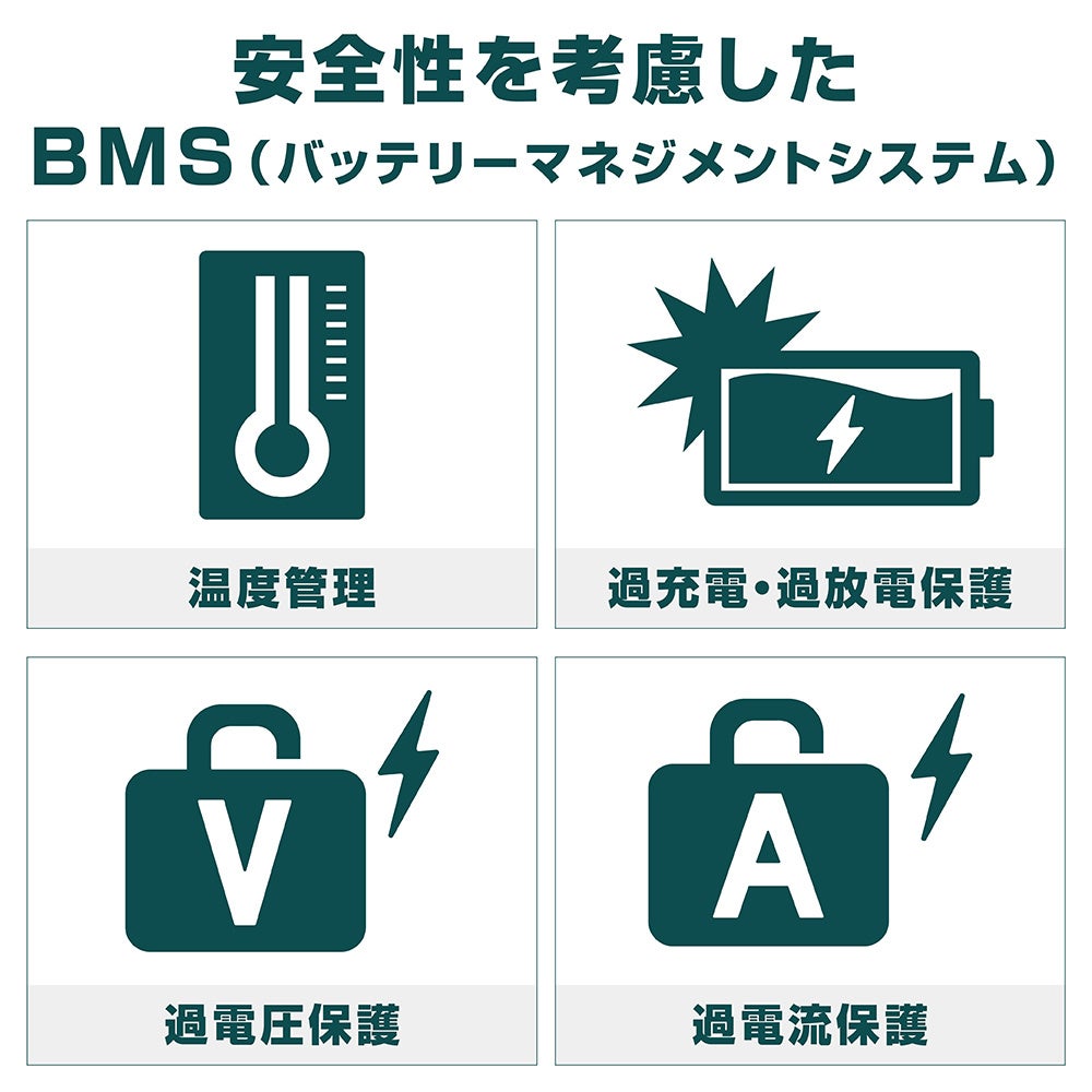 A. 本製品の放電深度は90%に設定し、90%以上は放電しない設計になっております。これは過放電によってバッテリーが劣化・破損してしまうのを防ぐ機能です。