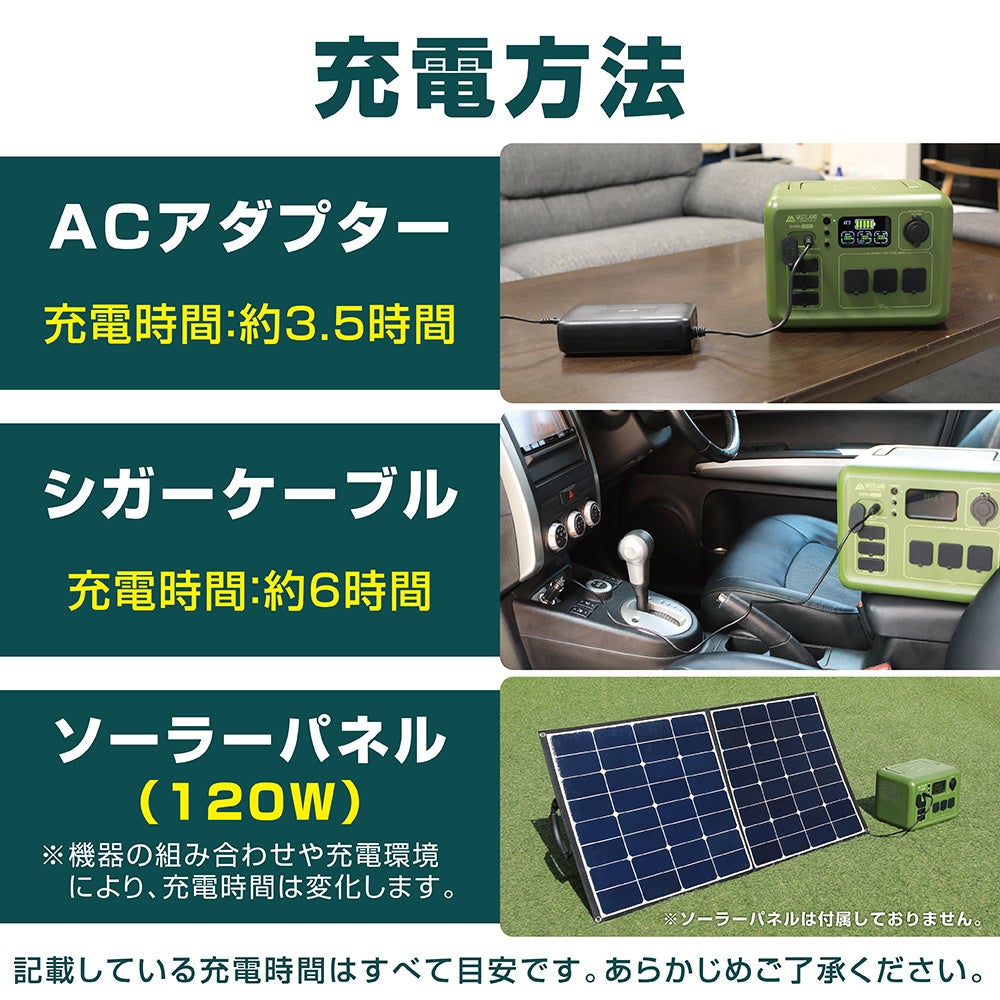 | 出力ポート | ワイヤレス出力(×1):5W/7.5W/10W/15W USB-C(PD)出力(×1):5VDC/9VDC/12VDC/15VDC/20VDC 3A 60W USB-A1出力(×2):5VDC 3A/9VDC 2A/12VDC 1.5A 合計36W USB-A2出力(×2):5VDC 3A 合計15W シガーソケット(×1):12VDC 10A 120W AC出力(×3):100VAC 5A 50/60Hz 合計500W(瞬間最大750W) 周波数 50Hz/60Hz切替可能 |