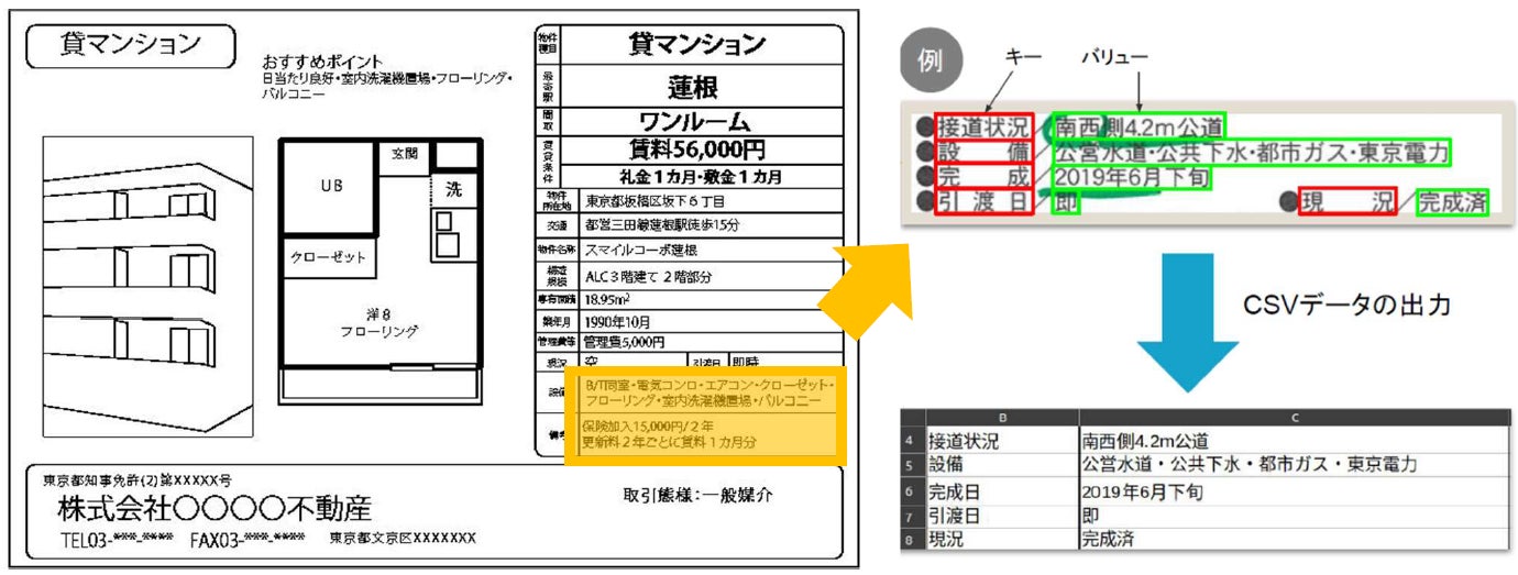本発明による書類画像処理システムでは、テンプレートデータを使用せずに、必要な情報を正確に特定することができます。この発明により、当社のAI-OCR(AIスキャンロボ🄬)では、レイアウトの異なる帳票類であっても、事前のテンプレート準備をせずに読み取りが可能となりました。