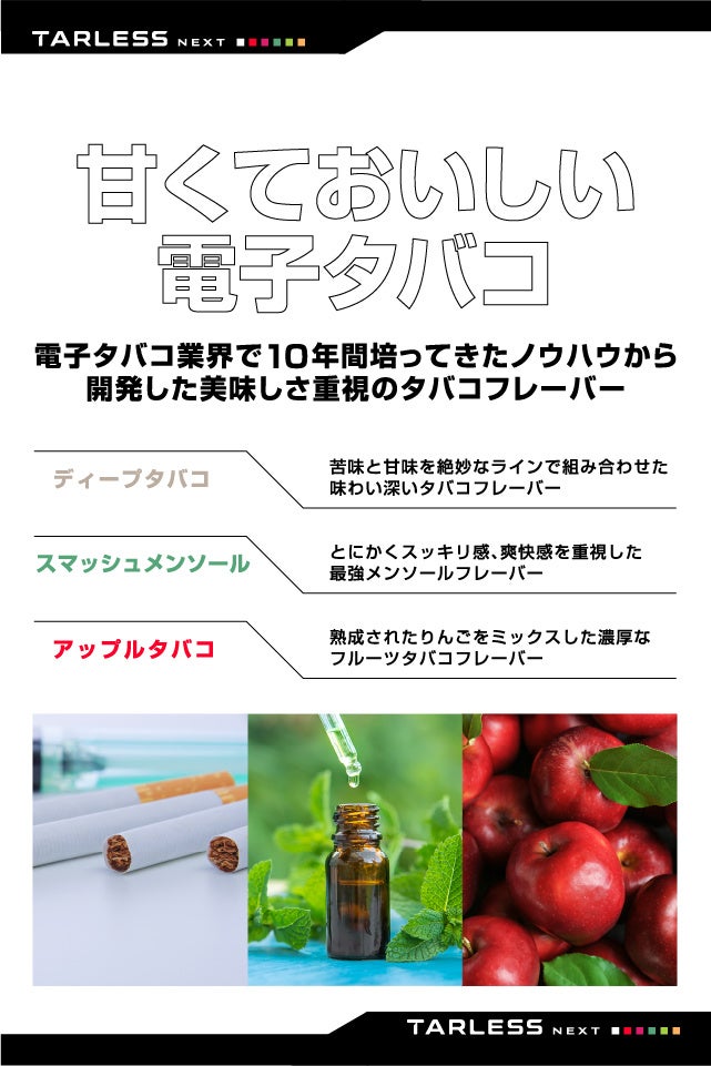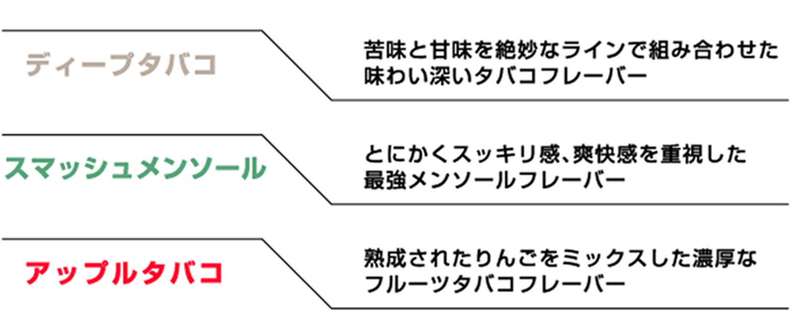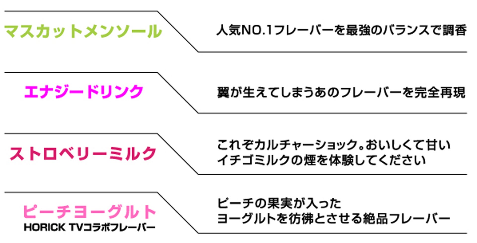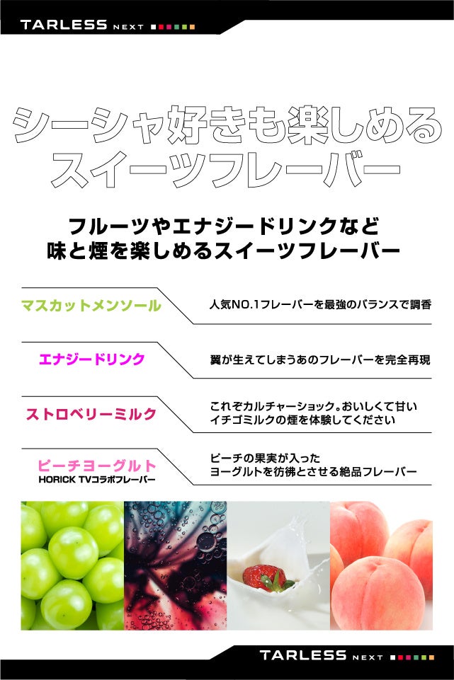喫煙者にとっては衝撃の『甘くて美味しいタバコフレーバー』が3種、シーシャ好きにとっては大満足の『スイーツフレーバー』が4種のフレーバーを採用。