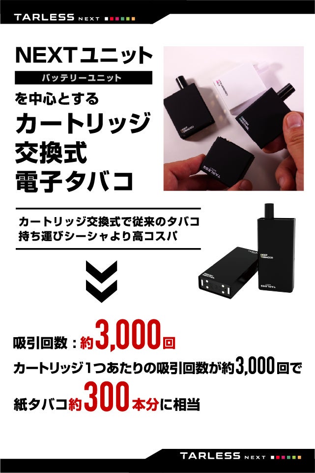 TARLESS NEXTはバッテリーユニットを中心にカートリッジを交換することで紙タバコや加熱式タバコ、持ち運びシーシャよりも高コストパフォーマンスを実現しました。