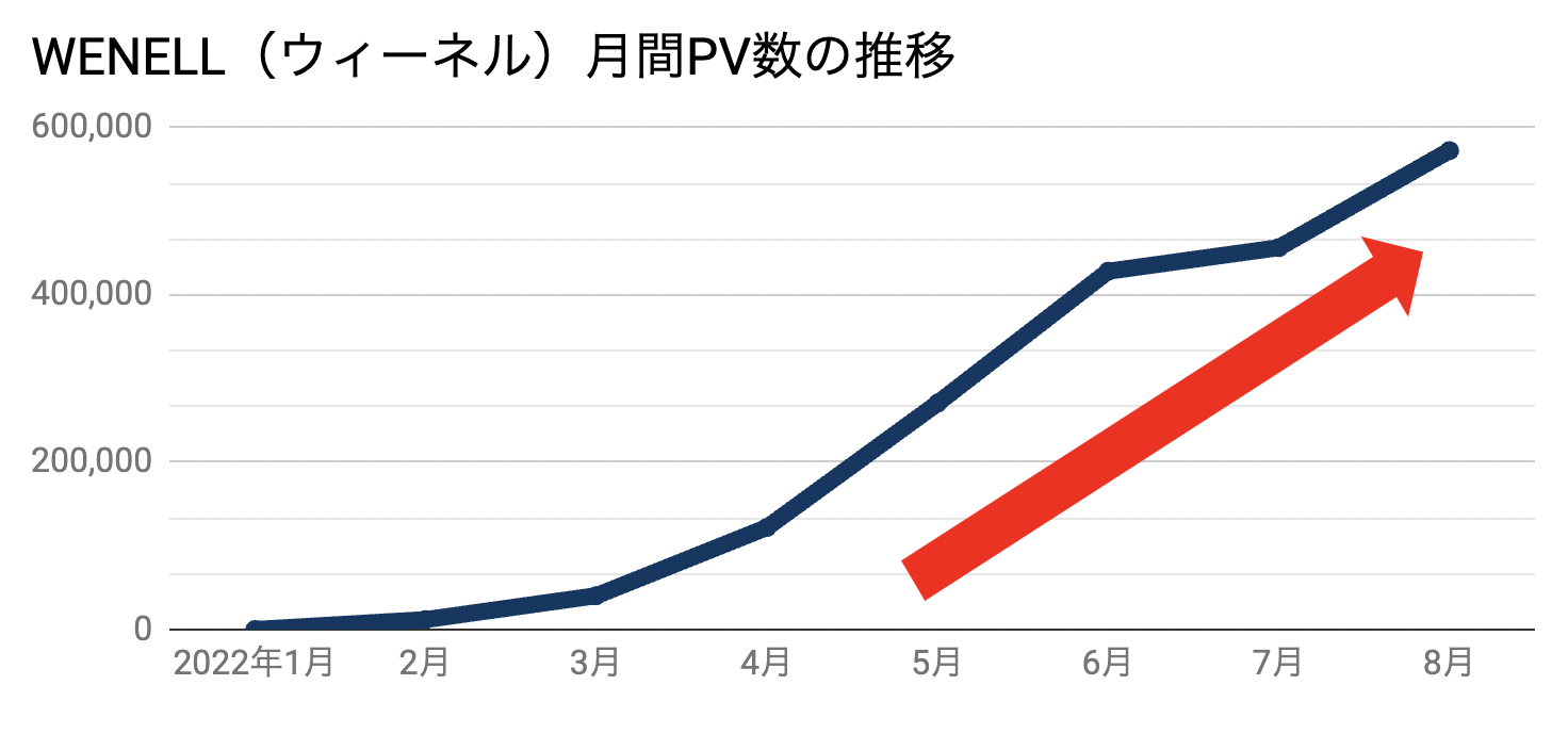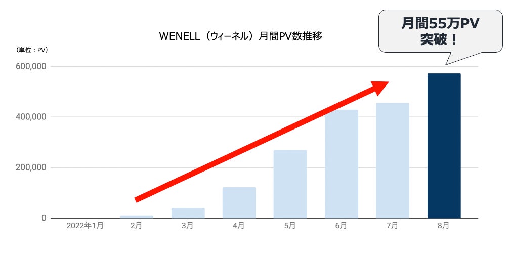 WENELL(ウィーネル)は、2022年1月のプレリリースから3ヶ月間で月間10万PVを突破して以降順調に成長を重ね、リリース7ヶ月というスピードで、月間PV数において日本最大級の睡眠メディアへと成長しました。