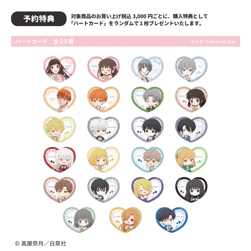 対象商品のお買い上げ税込3,000円ごとに、予約購入特典として「ハートカード(全23種)」をランダムで1枚プレゼントいたします。※アニメイト通販は予約購入特典対象外です。