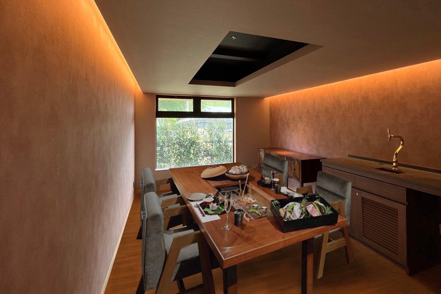 お食事は朝夕、室内の専用ダイニングでのお部屋食をご提供いたします。ご夕食はバトラーがゲストの目の前で炭火で焼き上げる、目でも楽しめる囲炉裏会席をお楽しみください。