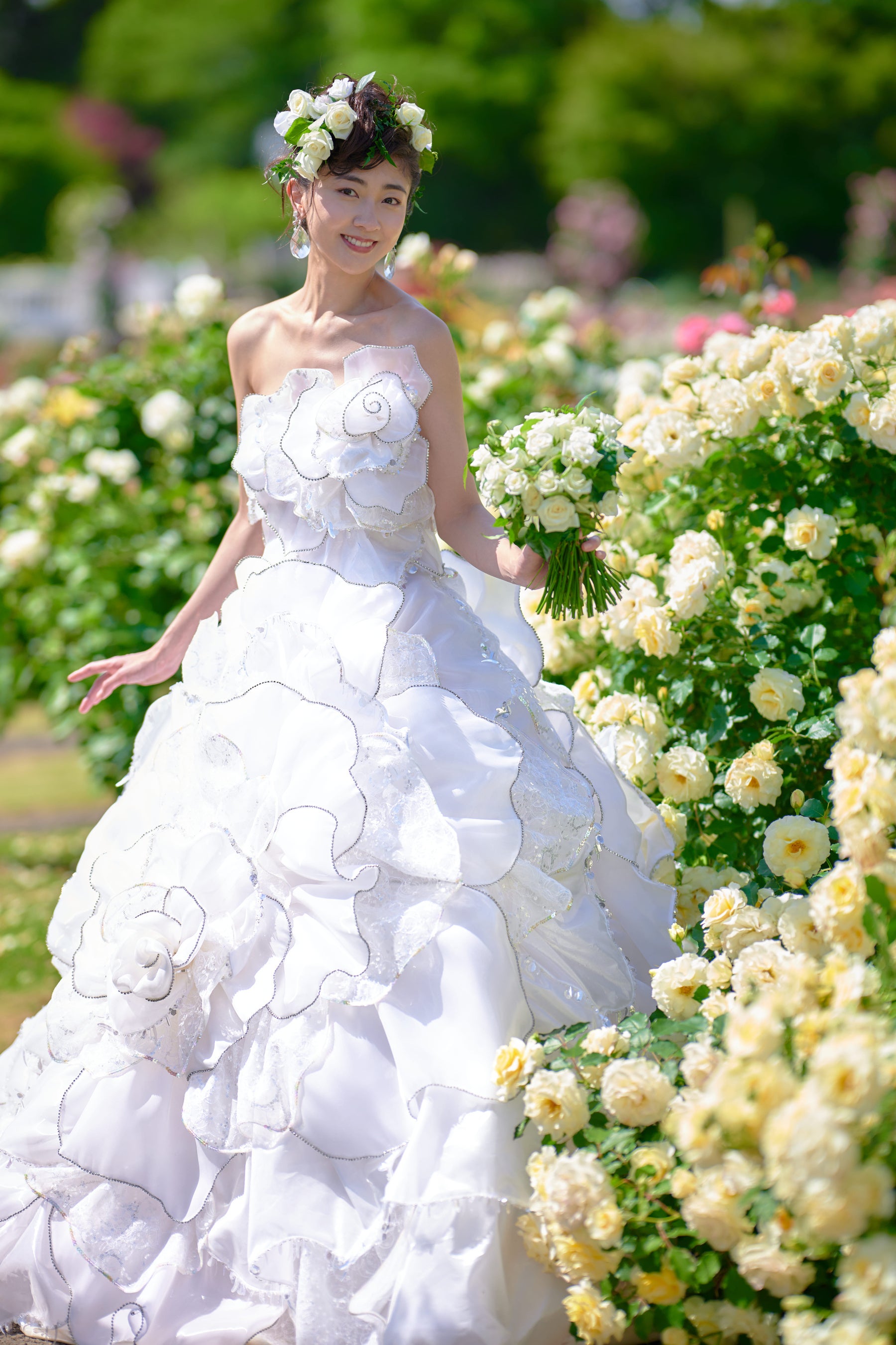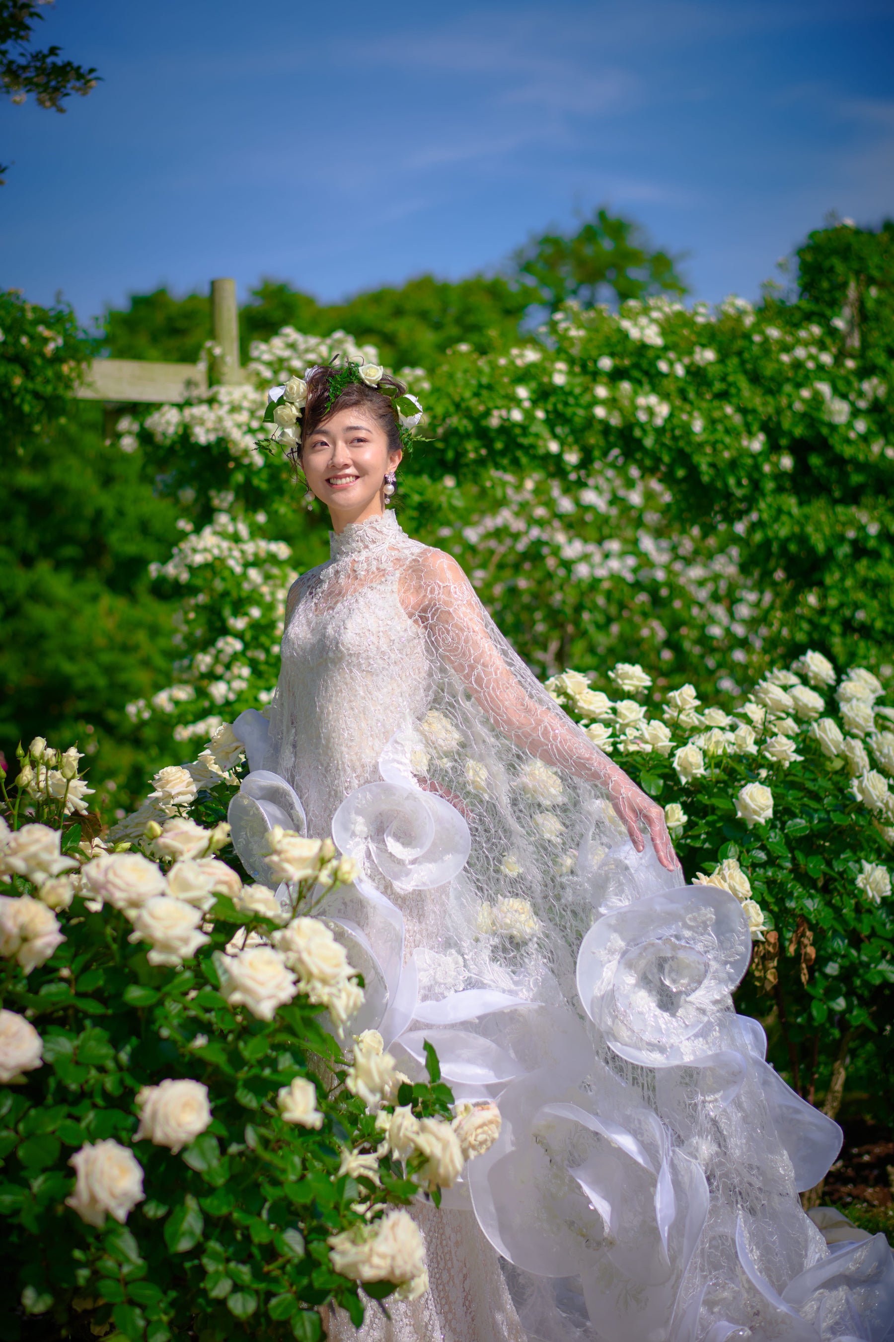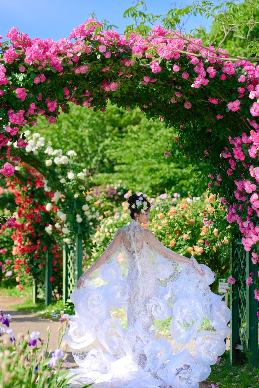 撮影場所は千葉県八千代にある京成バラ園。本園は1998年に、デザイナー桂由美の名前から名付けた白い”ローズユミ”を発表。純白でエレガントなこのローズユミは、花嫁の結婚式のブーケにぴったりと、桂由美が生涯こよなく愛し、デザインモチーフとしてきた花であった。